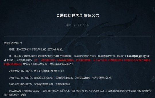 腾讯MMORPG《塔瑞斯世界》国际服停服后,国服也宣布将于2026年2月11日停服,2025年12月12日起停止充值及新用户注册。本作于2024年6月12日公测,运营不足一年半。 停运具体事项安排: 2025年12月12日17点,停止游戏充值和新用户注册; 2026年02月11日17点,正式停止游戏运营,关闭游戏服务器,关闭游戏官网,用户无法登录游戏; 2026年02月25日17点,官方QQ群/微信群、专属客服关闭。 2025年12月12日17点前购买过《塔瑞斯世界》产品并且账户里有代币留存的用户,可在补偿活动进行期间进入补偿页面根据自己的账号余额,领取《我叫MT4》手游、《天龙八部》手游、《完美世界》手游和《黑色沙漠》端游、《无畏契约》端游的相关礼包。领取规则如下: 余额大于0,小于等于100,领取一个价值10元的礼包(即A档礼包); 余额大于100,小于等于1000,领取一个价值100元的礼包(即B档礼包); 余额大于1000,小于等于5000,领取一个价值500元的礼包(即C档礼包); 余额大于5000,领取的礼包个数=账户余额除以5000后的数字进位取整,即小数点进位+1;例如,用户账户余额为6000,则他可以领取的礼包为2个(1.2升级为2)价值500元的礼包。 |