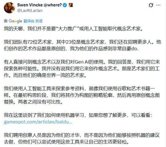 在2025年TGA颁奖礼上,拉瑞安工作室公布了其最新项目《神界》系列新作,引发玩家广泛期待。然而不久后,工作室首席执行官Swen Vincke在接受彭博社采访时透露,该作将采用生成式AI技术辅助开发,随即在玩家与前员工间引发激烈争议。 Swen在采访中表示,新作将延续回合制RPG玩法,并自信称其将“远比《博德之门3》更优秀”。但他也坦言,尽管公司内部对AI使用曾有分歧,目前团队已基本接受当前的应用方式。 此言一出,迅速在社交媒体与行业论坛上激起反对声浪,不少前员工与玩家对拉瑞安采用AI技术表示失望与担忧。 为平息争议,Swen通过IGN发表正式声明强调:拉瑞安不会用AI替代任何开发人员,也不会发布包含AI生成内容的游戏。他在声明中指出: “我们持续扩充概念艺术家、编剧与叙事设计师团队,积极组建编剧室、推进演员选角与配音工作,并招聘更多翻译人员。仅概念艺术团队已有23人,且仍在扩招。这些艺术家日复一日为创意与生产环节贡献原创设计。我们的一切努力都是增量式的,旨在让人们拥有更多创作时间。” “任何机器学习工具若运用得当,都应成为创意团队或个人工作流程的补充,而非对其技能与工艺的取代。我们正研究如何将前沿机器学习工具应用于创意工作,探索其如何减轻日常负担,从而帮助我们打造更好的游戏。我们既不会推出含AI组件的游戏,也无计划通过AI缩减团队规模。尽管这一议题情绪色彩浓厚,我们始终围绕‘让每个人的工作日变得更好,而非更糟’这一原则进行内部讨论。” Swen同时也在社交以更轻松的语气回应了相关批评。 值得一提的是,此前曾被曝在最终游戏中使用AI生成素材的《光与影:33号远征队》开发商Sandfall Interactive,仍在TGA上斩获年度游戏等多项大奖,并于颁奖后新增20万份销量。 |