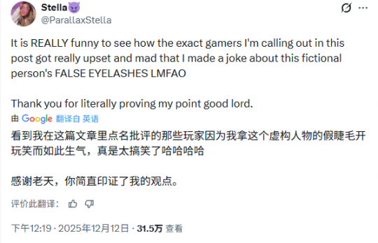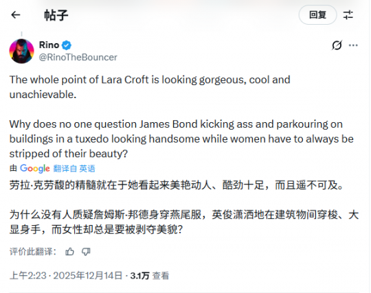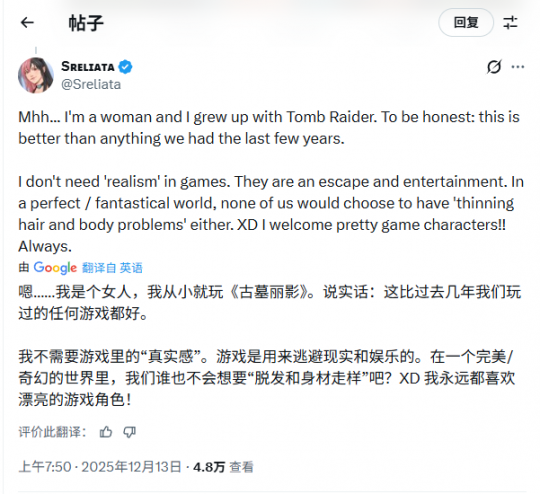 近日,围绕在TGA 2025上公布的《古墓丽影:亚特兰蒂斯遗迹》重制版女主角劳拉·克劳馥新形象的争议在社交媒体持续发酵。事件起因是游戏记者Stella Chang的一条帖子,她以在IGN工作和评论电子竞技而知名。她表示,新版劳拉的光鲜外观不符合“在亚特兰蒂斯丛林中为生存而战”的设定,她指出角色妆容过于精致,缺乏求生感。 “哇,劳拉·克劳馥的这个新造型真是太突兀了。 我开玩笑说她看起来像那些反觉醒、整容过度的‘让游戏角色再次性感化’照片,但我不知道这玩笑现在还能不能算玩笑了。 什么意思?她明明在生死边缘挣扎,却戴着厚厚的假睫毛???” 这条推文迅速走红,获得了上百万浏览量和数千次转发。劳拉的粉丝指责记者心怀嫉妒和无知,无论男女都纷纷为劳拉声援。 许多人强调,1996年的经典劳拉是偶像象征,拥有夸张的身材、模特般的外貌和自信,而不是2013–2018年《生存者三部曲》中那种“现实主义求生者”。 对于粉丝们的指责,Stella Chang直接在评论区回怼道:“看到我在这篇文章里点名批评的那些玩家因为我拿这个虚构人物的假睫毛开玩笑而如此生气,真是太搞笑了哈哈哈哈!感谢老天,你们印证了我的观点。” |