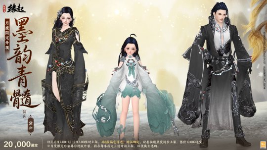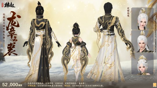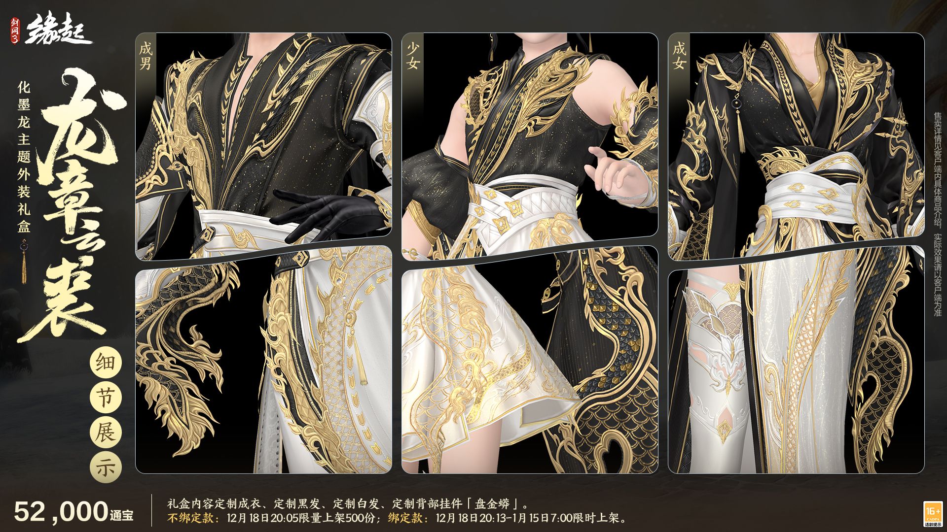 琼霰漫天舞,临妆映镜光。岁末将至,精彩不断,12月18日全新外观即将上架商城,为寒冬增添一份靓色!全新化墨龙主题外观礼盒「龙章云裘」以玄、素、灿金三色,绘新岁之象;外装礼盒「吉祥颂」以民族风搭配为侠士增添暖意;月度限定外观「墨韵青髓」2款全新偏色携6款经典偏色描绘丹青画魂;更有精美头饰及眼饰为侠士的搭配添彩。月度充消同步更新,三倍积分活动惊喜不断! 化墨龙主题外观礼盒「龙章云裘」 玄墨为身金为骨,云动龙吟破九霄。全新化墨龙主题外观礼盒「龙章云裘」如金曦破晓而来。 劲装衣袍整体裁剪流畅,形制优雅,兼具古典的宽博与修身的利落。墨白金三色交织,衣袍纹饰精微,龙章祥云盘踞其上,自生神韵。 成男款内衬深衣层叠交错,金龙腾云姿态自肩头迤逦而下,盘绕整个袖身。腰间以白色宽腰带紧束,其上金属扣饰精巧,腰带上祥云暗纹与金线勾勒相得益彰;两侧外袍裙摆处,龙纹图案尤为夺目,更添威仪。 成女款以金玉镂空冠冕压顶,额前发丝轻垂。金线勾勒的祥龙腾云之姿蜿蜒而下,袖口处化作鳞片与流云纹样,气韵非凡。外裙裙摆墨白交叠,金龙盘绕,线条流畅,磅礴优雅。 萝莉款腰间系白色腰封,金丝缠绕,并有飘逸的白色短裙,裙身以金线勾勒游龙和祥云纹样,龙尾舒展,恣意灵动。 特效挂件「盘金蟒」开启后漆黑玄蛇蜿蜒盘绕于肩头,无声游走。鳞甲细密,蛇首微微昂起,双眸金光隐隐作现,灼灼生辉。 外装特效共有4段,角色手持双刃,黑白双蛇环身而起,翻腾于混沌云海,金鳞闪烁,威仪凛然。 售卖信息: 售价52,000通宝。 不绑定款礼盒12月18日20:05限量上架500份; 绑定款礼盒12月18日20:13-1月15日7:00限时上架。 成衣套装礼盒「吉祥颂」 云山瑞雪颂吉祥,全新成衣套装「吉祥颂」为寒冬增添暖意。 外观尽显淳朴,共有4款偏色可选。领口、袖口及衣摆以毛裘镶边,柔软而温厚。精致的锁链、珠串点缀其上,于腰间、襟前摇曳生姿,又增添了几分民族风味。 成男款裁剪简洁大方,凸显玉立之姿。袖缘亦覆有毛裘,更添几分尊贵。宽大披帛斜搭于肩自胸前至腰间缠绕而下,其上各样暗纹点缀,不见繁琐、唯显大气。 成女款身着一袭长裙,裙摆轻垂。外层罩以广袖长袍,边缘皆有雪白绒毛,厚实温暖。内衬密布金线绣织的祥云纹饰,华贵而内敛。腰间垂挂银链、红穗与琉璃珠串,步履间轻轻晃动。 萝莉款繁复而精巧,身着短袍,外覆一件短款袄衣,衣摆恰及膝上,袖口与衣领同样铺陈着厚实的雪白绒毛,胸口垂下多串细链与朱红流苏,乖巧之中尽显民族风味。 售卖信息: 豪华版内含成衣+定制黑发+定制白发,售价38,000通宝,不绑定款12月18日20:07限量上架500份。 标准版内含成衣+定制黑发,售价28,000通宝,不绑定款12月18日20:09限量上架500份。 绑定款礼盒12月18日20:13-1月15日7:00限时上架。 月限墨韵青髓 墨韵清绝,青岚化髓,月度限定外观「墨韵青髓」携两款全新偏色「墨玉」、「绯烟」描摹丹青画魂。 外观以水墨气韵为骨,丹青为魂,融唐风雅韵入形制。衣衫流丽,玄墨深沉,青翠明澈,雪白素雅。其间珠玉点缀,如行画中,承载着水墨丹青的无尽风华。 成女款一袭长裙裁剪贴身,袖摆宽大,其上水墨纹样氤氲而开,仿若远山含黛,云雾缭绕,深浅晕染间,描摹出水墨画的层次与意境。 成男款玄墨深沉,其上墨色云纹与银丝暗纹交织,行云流水般铺陈,劲健有力。宽袖阔口,袖身可见泼墨晕染之痕,苍劲而富有力度。 萝莉款着一袭轻盈短裙,一对宽袖垂坠两侧,薄如烟霭,随风摇曳。裙摆精巧错落,缀以各色珠宝;色彩自然晕染开来,仿佛墨彩在宣纸上氤氲流转。 售卖信息: 售价20,000通宝,均为绑定款, 12月18日7:00-1月12日7:00限时上架。 配套黑发同步返场,售价10,000通宝。 头饰 蝶栖云鬓,翠羽翩然,两款头饰「潋翼」、「柔翎」即将上新。 潋翼以鎏金丝线,勾勒出蝶翅轻展的蜿蜒轮廓,嵌以薄透之色,自碧波潋滟渐晕至淡青如水,如随风动而翩跹。 柔翎其形纤长,以簇簇翠羽点缀双耳,颜色渐次深入,或青翠欲滴,或皎洁如玉,或如朱雀衔火,各具特色,尽显神韵。 售卖信息: 单款饰物售价6,000通宝,均为绑定款, 12月18日7:00起长期上架头饰商城。 眼饰 星芒伴月,飞燕衔枝,全新眼饰「墨月叇」、「金错羽」登场! 「墨月叇」单侧金链低垂,以星芒衔接镜框,颜色深沉,静观世道,不言而明。 「金错羽」以双燕衔枝的造型创作,衔得天光,细珠缀于其上,融作眉间一抹绝色。 售卖信息: 售价15,000通宝, 不绑定款礼盒12月18日20:11限量上架300份,开启后可在两款眼饰中任选一件; 绑定款眼饰12月18日20:13-1月15日7:00限时上架。 月度充消 充消好礼12月18日更新,活动期间充消达到指定档位即可获得精巧挂件奖励,12月18日7:00至12月25日7:00期间享三倍积分! 充消最高档可解锁全新特效背部挂件「仪威龙韵鼓」,玄鼓三面,形制古朴,朱金纹饰细密缠绕其上。 特效开启后,三鼓排列,舞者足尖轻点,踏鼓如行水,足音细碎,腕动臂舒,身姿曼妙。身后煌煌宝相花图腾盛开,鎏金边线勾勒出层叠祥云,于虚空中蔓延舒卷。 岁暮天寒,暖心回馈,《剑网3缘起》新衣上新,为素白天地点染一抹亮色,伴侠士走过凛冽长冬! |