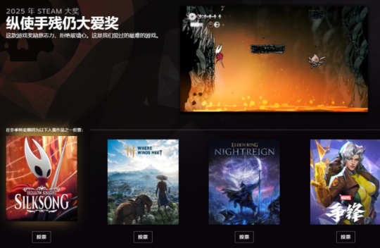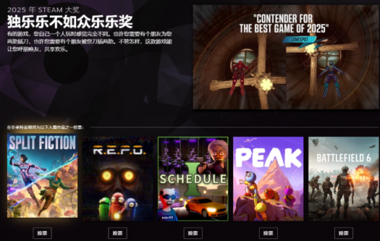 今日, Steam已正式启动2025年度Steam大奖的玩家投票环节,并同步揭晓了全部11个奖项的提名游戏名单,最终获奖者将由全球玩家社区投票决定。投票将持续到 Steam 冬季促销活动结束——获奖者将于 2026 年1月4日揭晓,快来选出你们心目中的年度最佳吧! 年度最佳游戏奖 《光与影:33号远征队》 《天国:拯救2》 《ARC Raiders》 《超英派遣中心》 《空洞骑士:丝之歌》 年度最佳VR游戏奖 《午夜漫步》 《F1? 25》 《Pavlov》 《Le Mans Ultimate》 《Emissary Zero》 爱的付出奖 《绝地潜兵2》 《Dota 2》 《博德之门3》 《无人深空》 《Rust》 最佳 Steam Deck 游戏奖 《数码宝贝物语 时空异客》 《黑帝斯2》 《球比伦战记》 《四叶草深渊》 《深岩银河:幸存者》 独乐乐不如众乐乐奖 《双影奇境》 《R.E.P.O.》 《战地风云? 6》 《Schedule I》 《PEAK》 杰出视觉风格奖 《寂静岭f》 《ENA: Dream BBQ》 《我的小柯基》 《最终幻想7:重生》 《毁灭战士:黑暗时代》 最具创意游戏玩法奖 《Mage Arena》 《蓝途王子》 《ARC Raiders》 《逃离鸭科夫》 《欧陆风云5》 纵使手残仍大爱奖 《空洞骑士:丝之歌》 《艾尔登法环 黑夜君临》 《漫威争锋》 《流放之路2》 《燕云十六声》 最佳原声音轨奖 《Marvel's Spider-Man 2》 《首都高赛车》 《光与影:33号远征队》 《DELTARUNE》 《节奏裂隙》 杰出剧情游戏奖 《The Last of Us? Part II Remastered》 《寻找伪人》 《天国:拯救2》 《超英派遣中心》 《消逝的光芒:困兽》 轻松惬意奖 《我们到了吗?》 《放松时光:与你共享Lo-Fi故事》 《冲就完事模拟器2》 《Megabonk》 《Slime Rancher 2》 |