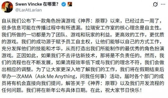 拉瑞安工作室近日就旗下新作《神界》的开发争议发表公开声明,承诺将在假期结束后公布更详细的信息。这款备受期待的角色扮演游戏于一周前正式公布后,围绕工作室开发模式的讨论持续发酵。 拉瑞安工作室CEO斯温·文克亲自发布回应声明。文克承认《神界》公告中的某些内容被误解,并强调了工作室长期坚持的开发理念,重申玩家选择与开发者自主权始终是拉瑞安的核心特质。他表示工作室致力于构建灵活的工作流程,使开发者能够打造出最出色的角色扮演游戏。 他还指出内部流程并非一成不变,当某些流程与工作室价值观不符时会持续评估并调整。针对技术应用方面的担忧,文克解释称评估新工具是责任而非原则性妥协。同时强调若流程被证明低效或与创意文化冲突,工作室会及时调整——这似乎正是他想要传达的核心观点。为增进透明度,拉瑞安确认将在假期后举办跨部门问答会。 《神界》是拉瑞安继《博德之门3》成功后回归其旗舰宇宙的全新回合制角色扮演游戏,于今年TGA颁奖典礼首次亮相。工作室同时宣布计划于2026年底开启游戏抢先体验阶段。 |