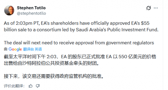 卖出550亿美元!EA股东同意沙特主权基金收购公司