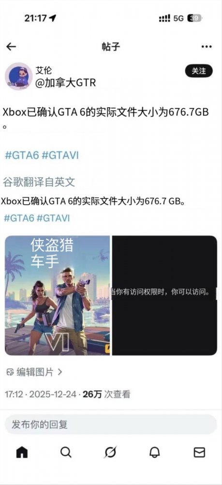 在平安夜(12月24日),有社交媒体分享了一张图片,上面显示Xbox商店中《GTA6》的大小为惊人的676.7GB。这一图片迅速以病毒式传播到了各个社交媒体平台。不过,粉丝玩家迅速驳斥了这一说法,认为这绝无可能。 这些帖子在社交媒体上出现后,玩家们很快发现这是伪造的,他们指出官方商店页面并未列出文件大小,且Rockstar之前的作品如《荒野大镖客2》最大容量约为150 GB。并且玩家们指出没有游戏容量接近600+ GB;即使是《使命召唤》系列这样的超大型作品,最大也只在200GB左右。并且高达600多个GB的大小基本上占满基础版PS5或Xbox Series X|S的整个硬盘。由此来看,这则帖子显然是个为了博取流量的骗局。 玩家们在该帖子在社交媒体上出现后疯狂调侃。有用户表示"真有人会相信《GTA 6》的大小是676.7 GB?真的吗?没人注意到这明显的'67'(国外低俗梗)玩笑吗?"另一条评论写道:"我希望这不是真的。"还有人调侃:"怎么就没人看出来这是个玩笑呢,太明显了。“ 这则病毒式帖子反映了大众对《GTA 6》的巨大期待,由于《GTA6》宣布延期,网络上流传了大量关于此游戏的谣言,此类谣言大多都是毫无根据的。事到如今,只能静候R星与Take-Two的官方消息了。 |