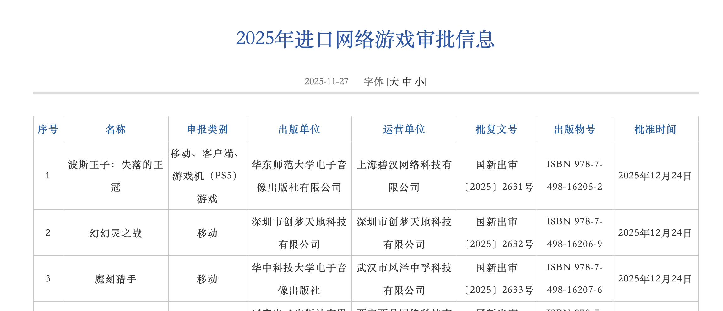 近日,国家资讯出版署发布2025年12月网络游戏审批信息,共有144款国产网络游戏和3款进口网络游戏过审,其中包括《波斯王子:失落的王冠》客户端与PS5版、《逸剑风云决》移动版、《QQ经典农场》移动版等。