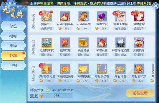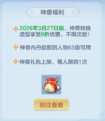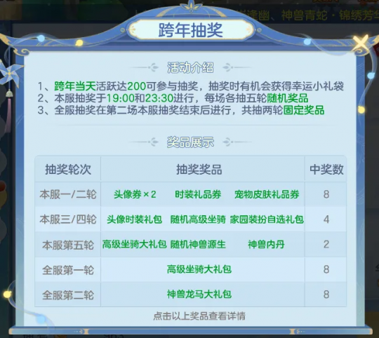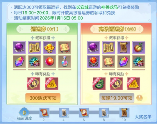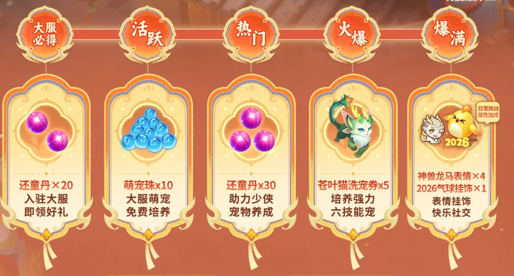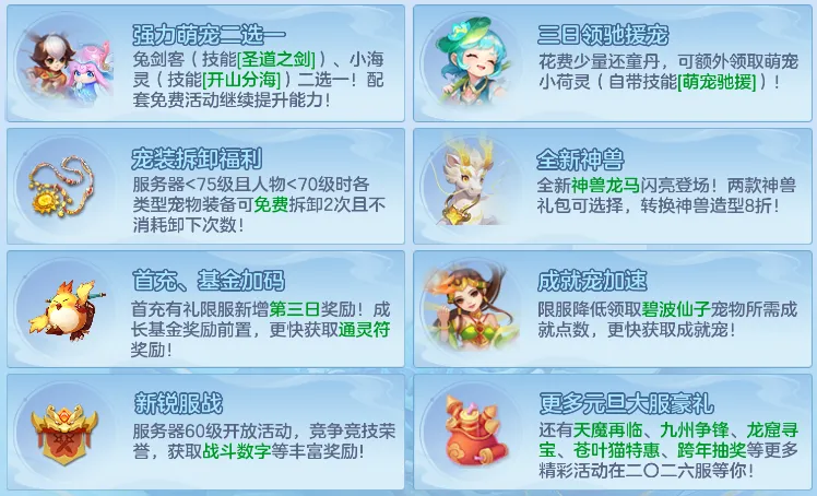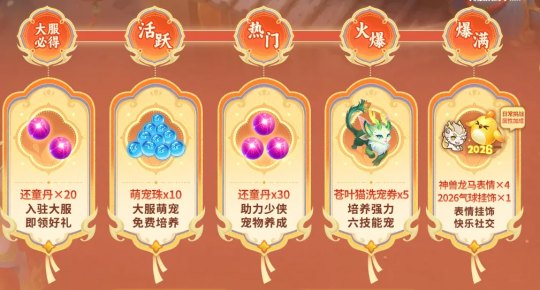 《幻唐志:逍遥外传》元旦新内容上线,全新神兽龙马陪你闯荡三界!还有跨年抽奖、龙马赐福等诸多元旦福利活动,神兽之灵、通灵符等海量奖励等你来领!元旦大服『二〇二六』12月26日正式上线,快和好友们一同踏上充满乐趣的三界之旅! 全新【神兽龙马】 龙马现世,一马当先,新增神兽龙马及其配套福利: 1)全新神兽龙马携带特殊技能【一马当先】; 2)限时开放更换神兽造型八折活动; 3)限时开放神兽龙马的宠物跟随功能; 4)服务器等级≥65级,2025年12月26/27/28日每晚加拍一个神兽内丹; 5)使用神兽内丹的人物等级将全服调整为65级; 6)服务器等级≥75级,外观货架新增4个特惠神兽之灵售卖; 7)服务器等级≥75级,已购买过神兽礼包的玩家在活动期间可加购一个限时神兽礼包,礼包价格随神兽之灵市场价浮动。 全新神兽皮肤 全新神兽皮肤【神兽玉龙将·彼岸逢幽】【神兽青蛇·锦绣芳华】来袭: 1)兑换方式:消耗神兽之灵进行兑换; 2)皮肤祝福:神兽、仙兽皮肤加成调整为属性加成。 龙马赐福 龙马赐福活动开启: 1)每日活跃可领取福运券,找到在长安城巡游的神兽龙马可兑换奖励; 2)每日19:00-20:00限时开放高级福运券的领取和兑换; 3)兑换高级福运券一定次数还可获得通灵符、神兽龙马表情券等奖励。 幻唐跨年夜 12月31日幻唐跨年夜,与你一同迎元旦: 1)跨年抽奖活动分别于当晚19:00和23:30进行,有机会获得源生之灵、神兽龙马(含内丹)、坐骑元神·高级(含装饰光华)等大奖; 2)此外,当晚23:59《幻唐志:逍遥外传》与你一起倒数迎元旦,届时会给大家送上红包祝福哦! 外观货架上新 1)新品华彩系列主题外观限时上架; 2)元旦礼包、元旦小礼袋特惠上架; 3)服务器等级≥60级,可在外观货架界面限时领取一枚貔貅古币。 天赐良缘 天赐良缘活动开启: 结婚和更换夫妻称谓半价、豪华婚礼和浪漫婚宴八折、婚服特惠、世界祝福和红包八折、首次结婚可得限时挂饰、结婚时还有红娘送祝福哦~ 头像特惠 服务器等级≥75级,活动期间奇货商城限时上架2张八折头像券; 招募回归系列活动 1)回归有礼:回归活跃抽好礼,非回归角色与回归组队参与日常可获得积分,邀请回归绑定后可获得更多积分; 2)回归子女:回归子女限时返场,加速培养效率,参与培养可解锁摩诃无量、挺身而出等技能助力日常挑战; 3)回归立领法器材料强力符石、天魔宝物,助力回归参与日常挑战。 排位明星赛 1)淘汰赛名单将在12月26日23:00确定,启明组和常规组比赛分别于12月27日和28日进行,请参赛选手做好准备; 2)增加了相关成就。 分享有礼活动 活动期间,可在分享有礼界面中分享给好友,邀请好友接福运赢好礼。 战斗相关调整 1)子午心灯使用后获得的“守心”状态提高至4回合,“守心”状态下附加“莲华度世”的效果调整至50%几率触发; 2)提高了无量100级核心星象中“召宠恢复”的作用单位和恢复量; 3)提高了无量100级分支星象中“喝酒恢复”的作用单位和恢复量,并新增使用三级药时也能触发的效果; 4)移除了“业报轮回”对护盾下的目标必然造成伤害的效果。 黑暗天罡限时活动 1)活动时间:2025年12月29日10:30-2026年2月2日01:00; 2)参与要求:活动期间限时降为人物≥90级,服务器≥90级; 3)活动期间排行榜将划分为多个等级段,并且每周排行前三的玩家将获得特殊外观奖励与道具奖励; 4)活动期间黑暗天罡将限时接入天魔再临活动的宝物效果,玩家可搭配宝物进行挑战。 珍宝商店调整 珍宝商店每日初始子女心得数目上调为20本。 竞技场相关调整 1)雄主区排行榜调整为130-140级,包含飞升角色; 2)尊主区排行榜调整为116-129级,包含飞升角色; 3)12月26日5点至8点雄主区、尊主区竞技场维护中暂无法参与,且对应排行榜暂不结算,8点后将根据新等级分区结算并重新开放参与; 4)限时开放竞技冲榜活动: ① 每日上榜后根据排名获得冲榜积分,可用于兑换神兽之灵、神兽内丹碎片等道具奖励; ②当对应服务器开放竞技场盟主分区后,少主分区不再开放该活动。 天魔再临调整 1)活动结束时间延至2026年1月30日05:00; 2)新服竞速排行:服务器达到55级时开启,每日击败霜魔参与竞速,可获得特殊称谓、成就等奖励,新服竞速仅限【二〇二六】及系列服开放。 神奇农场调整 1)活动结束时间延至2026年1月30日5点。 2)新增作物图鉴,收获达到指定条件的作物将获得点数,累计点数将获得额外奖励; 3)新增每日最高价值果实排行榜,本周六5点后开启,前3名将获得称谓奖励; 强身相关调整 1)本次调整对所有服务器开放; 2)帮派建筑练武场调整为服务器70级开放,建设后将解锁强身技能;强身技能调整为服务器70级且人物75级可学习,并随服务器等级提升逐步提高强身可学习等级上限; 3)当服务器达到70级: ①神秘银币商城和月卡商城将限时供应一定数量的三界密录; ②一定时间内,每天获取帮贡时有额外加成。 简易通灵符功能调整 1)使用简易通灵符将不再增加及清空通灵进度; 2)新增以下宠物可使用简易通灵符洗宠:火猪骑士、功夫小熊、灵石护卫、龙虾骑士、建木仙、祸斗、炎弓、神石护卫、冥刹。 大闹天宫玩法调整 1)新增自动升级修炼功能,可在准备厅传送人处开启功能; 2)己方摧毁2座以上箭塔后,战胜敌方5人队伍可获得“通关令牌”扣除敌方主将耐久; 3)取消前十分钟准备时间,进入远古战场后可直接进攻敌方。 录像平台调整 录像平台战报分页的部