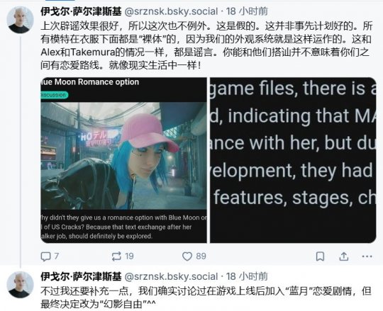 CDPR叙事总监伊戈尔·萨金斯基公开辟谣了游戏社区中关于《赛博朋克2077》曾经删减与游戏中的流行歌手蓝月的恋爱线。 此前,有Reddit用户发帖称在游戏文件中发现了这位歌手的详细裸体模型,并推测这与许多其他因开发问题未能进入最终版本的功能一样,是内容删减的证据。而这位叙事总监否认这一说法,并表示:“这是假的。我们从未计划过此内容。每个人物模型的衣服下面都是‘裸体’的,因为我们的外观系统就是这么设计的。” 他也提到了关于角色亚历克斯以及竹村的类似传言,强调能和角色调情不代表你可以和角色谈恋爱,就像现实生活一样。但他澄清了一点:“不过我要补充一点,我们确实在游戏发布后讨论过添加与蓝月谈恋爱的可能性,但最终决定改为制作《往日之影》” 通过这段话,他表示工作室确实考虑过与蓝月发展恋爱线的想法,但仅是在讨论游戏本体发布后追加内容的阶段。游戏中并未实际删减任何相关内容。 |