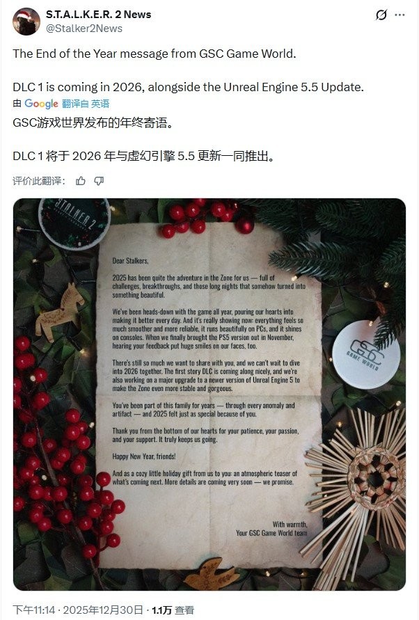 乌克兰游戏开发商GSC Game World今日发布全新预告,宣布其于2024年发售的后启示录风格第一人称射击游戏《潜行者2:切尔诺贝利之心》,将于2026年推出首个大型故事DLC。 预告片: 预告片以迷雾逐渐散开、切尔诺贝利核电站轮廓在背景中显现的画面收尾,并配文“2026年值得期待”,明确指向玩家将最终深入切尔诺贝利的核心禁地。 在同步发布的社区新年贺词中,GSC向玩家确认:“首个故事DLC正在顺利开发中。同时,我们正致力于将游戏升级至更新版本的虚幻引擎5,以使‘Zone’区域更加稳定和惊艳。” 自发行以来,GSC团队持续致力于优化游戏体验,修复问题并扩充内容。游戏于去年11月登陆PS5平台,标志着其触及了更广泛的玩家群体。仅在PS5版本发布一个月后,团队便推出了名为“未述故事”的大型免费更新,新增超过5小时的游戏内容,包含8个新任务、7个新地点、6个新角色、3件独特物品及一把独特的改装版GP37步枪。 尽管新预告未透露更多细节,但重返切尔诺贝利核电站这一核心场景,无疑为游戏的未来奠定了重磅悬念。 |