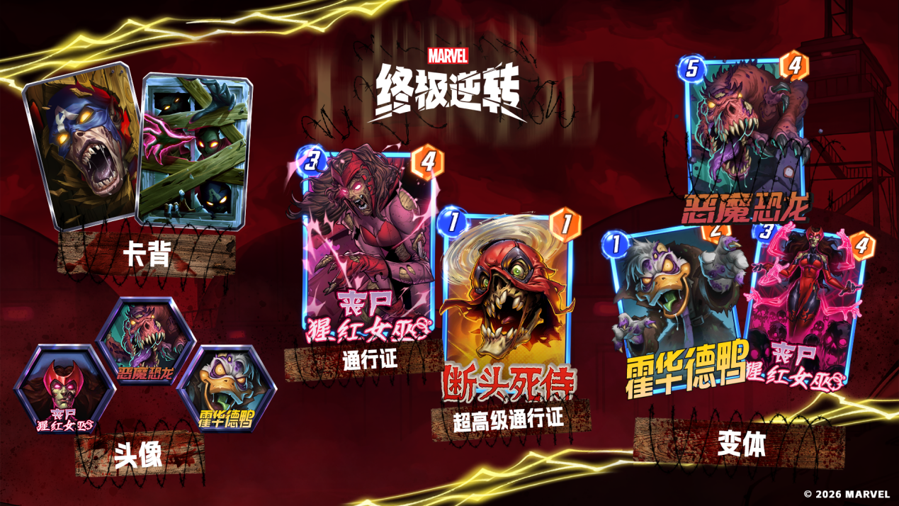 【赛季通行证】丧尸猩红女巫登场购买【丧尸大军】赛季通行证,就可以获得全新的角色「丧尸猩红女巫」。随着通行证等级的提升,还可以解锁全新变体、头像、卡背和其他资源。另外,购买超高级赛季通行证,即可获得「断头死侍」变体,得到变体时会同步获得基础卡。对于没有购买超高级赛季通行证的探员,「断头死侍」的基础卡可以通过合成或SNAPPACKS获得。 「丧尸猩红女巫」 [3/4] 你可移动此牌1次。你在此区域放置1张卡牌后,军团+2。「断头死侍」变体 [1/1] 此卡牌被删去时,会返回到你的手牌,然后使你手牌中所有卡牌战力+1。二、赛季全新卡牌和推出的时间全新机制: 1.军团:军团机制将在你场上不存在丧尸军团时为你创建一个军团,并赋予他卡面所标注的战力。如果你已经拥有一个或者一个以上的军团,则为所有的军团增加所标注的战力。注意,丧尸军团只要在场上,即便是盖牌状态,也会被视作存在军团。此时并不会额外生成一个新的军团。2.感染:感染机制可以将 非丧尸卡牌 转化为丧尸军团,保留他们原先的战力。友情提示:本赛季赠送的 饥饿。 可以让你的军团升级为 变异军团,具备感染能力。无论是自用搭建源源不断的丧尸大军,还是送给对手变异他的关键卡牌,都十分好用!千万不要错过!【赛季新卡】全新卡牌每周限时登场 系列5新卡系列5赛季全新卡牌可以在终极宝库、SNAPPACKS、合成获得。1.第一周 1月8日9点~1月15日9点 「丧尸神奇先生」终极卡包[2/2] 揭示:军团+2。激活:使你4张生成的卡牌战力+1。 2.第二周 1月15日9点~1月22日9点「丧尸吞星」终极卡包[7/4] 对战开始:抽出丧尸吞星,并从卡组中选择6张其他卡牌。揭示:将这些卡牌变成这张牌的复制牌。 3.第三周 1月22日9点~1月29日9点「美国上校」终极卡包[3/2] 揭示:丢弃1张手牌。持续:你每有1个回合丢弃过卡牌,你在此区域的其他卡牌战力+1。 4.第四周 1月29日9点~2月5日9点「丧尸惊奇队长」终极卡包[4/5] 回合结束:删去你在此区域的其他卡牌,每删去1张,战力+2。然后移动到一个你落后的区域。 系列4新卡系列4新卡会在赛季开始时全部开放。可以通过SNAPPACKS、合成定向获得;终极宝库中抽到系列4卡牌时也有概率获得新卡。「丧尸巨化人」 [5/3] 揭示:军团+1,然后此牌获得等同于你所有军团的战力。(会依次获得每个军团相等的战力并累加)「丧尸神力侠」 [2/4] 回合结束:若你在此区域领先,则丢弃你最左边的手牌。 【往期UP】时空卡包限时返场 1.第一周 1月8日9点~1月15日9点 「梦魇」&「星标」时空卡包「梦魇」[3/1] 揭示:将你每张手牌的文字随机替换成与其初始能量消耗相同的卡牌的文字。「星标」[3/10] 持续:你的对手在其他每个区域战力+3。 * 如果没有基础卡,在得到变体的时候会自动获得。2.第二周 1月15日9点~1月22日9点「冰月花雪」时空卡包[3/5] 揭示:为双方在此区域添加1张冰块。 冰块 [1/0]每回合开始时,能量+1。若你已填满此区域,则删去此牌。* 如果没有基础卡,在得到变体的时候会自动获得。3.第三周 1月22日9点~1月29日9点「月神孔苏」时空卡包[6/5] 被丢弃后,此牌返回手牌并进入下一个月相。揭示:将1张被你丢弃的卡牌复活至另一区域,并将其战力设为5。 弦月孔苏[6/8] 被丢弃后,此牌返回手牌并进入下一个月相。揭示:将1张被你丢弃的卡牌复活至另一区域,并将其战力设为9。 满月孔苏[6/12] 揭示:将1张被你丢弃的卡牌复活至另一区域,并将其战力设为14。 * 如果没有基础卡,在得到变体的时候会自动获得。4.第四周 1月29日9点~2月5日9点「灭霸」&「凯依拉」时空卡包「灭霸」[6/10] 对战开始:抽出灭霸并将六张无限宝石洗进你的卡组。「凯依拉」[3/4] 持续:你所有初始能量消耗为1和6的卡牌均无法被删去。 * 如果没有基础卡,在得到变体的时候会自动获得。 【战场外观】 星空迷航:丧尸围城使用【高级星空币】即可开启探索,当你集齐了当期的「战场背景」,「区域外框」,「头像框和名称栏」和「能量球」4个战场外观后,你将直接获得整个星盘上剩余的所有道具奖励(整个星盘总计有15000星尘徽章、16000点数和12个高级边框等奖励)。泳池派对通行证·复刻这是个复刻的通行证,如果你已经拥有泳池派对战场外观,则大奖会变为5个高级星空币。完成通行证任务提升通行证等级,解锁【星尘徽章】和【高级星空币】等奖励,若您选择购买通行证,更能解锁 Mega 分离因子、战场背景等专属奖励。【星尘徽章】可以兑换【高级星空币】、名称栏、高级神秘变体、神秘变体、Mega分离因子和边框等奖励。S17赛季已经调整的内容1.星空迷航开放时间修改。改为全赛季开放,开启和结束的时间和赛季的时间一致。2.新增奖励加成功能。星空迷航内当期的战场外观增加奖励加成(强化因子、联盟任务积分和限时任务加成),加成的时效仅限当期赛季,到下一期就不在生效。获得即可激活奖励和加成,不需要装备。举例说明:S18 赛季星空迷航战场外观【丧尸围城】,获取后可立即享受本赛季专属加成,该加成效果将在 S19 赛季失效,不再生效。3.星空币返还。根据抽到当期大奖的个数,返还相应的【限时星空币】。返还【限时星空币】的时间为下个赛季的首日,通过邮件发放。【限时星空币】:功能和星空币一样,但领取后需要在当前赛季使用完。 【限时模式】 1.死侍餐厅活动时间:2026年1月22日 9点~2026年1月29日 
