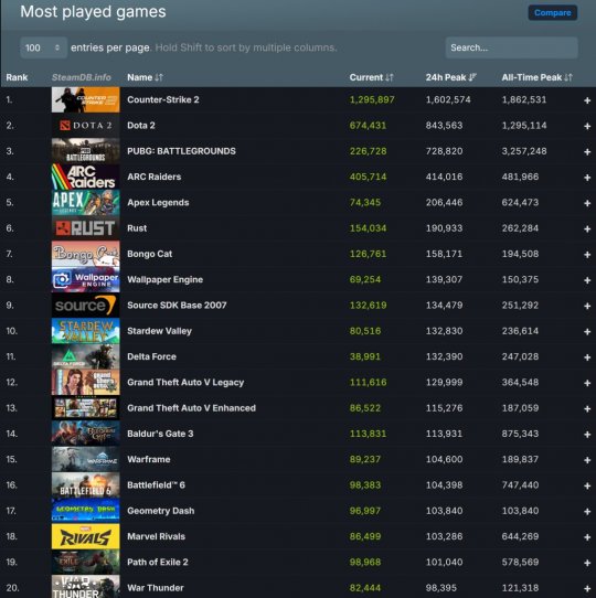 Steam刚刚创下了同时在线玩家数量的新纪录。今天早些时候,Valve的Steam平台同时在线玩家数量突破了4200万大关。更准确地说,是达到了4204万2778人。这足以说明为什么众多发行商都想把他们的游戏上架Steam平台。 过去24小时内最热门的20款游戏: 目前最热门的游戏是《反恐精英2》,其次是《DOTA2》。《绝地求生》位列第三,第四和第五名是《ARC Raiders》和《Apex英雄》。《Rust》排名第六,《Bongo Cat》排名第七。《Bongo Cat》是一款免费游戏,玩家每次按下键盘按键,Bongo Cat就会攻击任务栏。玩家可以通过收集积分来解锁帽子。 《星露谷物语》位列第十,紧随其后的是《三角洲行动》和《给他爱5》。《给他爱5》的经典版和增强版均跻身前20名。这有力证明了《GTA6》最终会登陆PC平台。GTA系列在PC平台拥有巨大的市场潜力。而且,尽管Rockstar和Take-Two对待PC玩家的方式并不尽如人意,但《GTA6》一旦登陆PC平台,必将取得巨大的商业成功。 排名第十四的是《博德之门3》。《星际战甲》和《战地6》分别位列第十五和第十六。最后,排名垫底的四款游戏分别是《几何冲刺》、《漫威争锋》、《流放之路2》和《战争雷霆》。 |