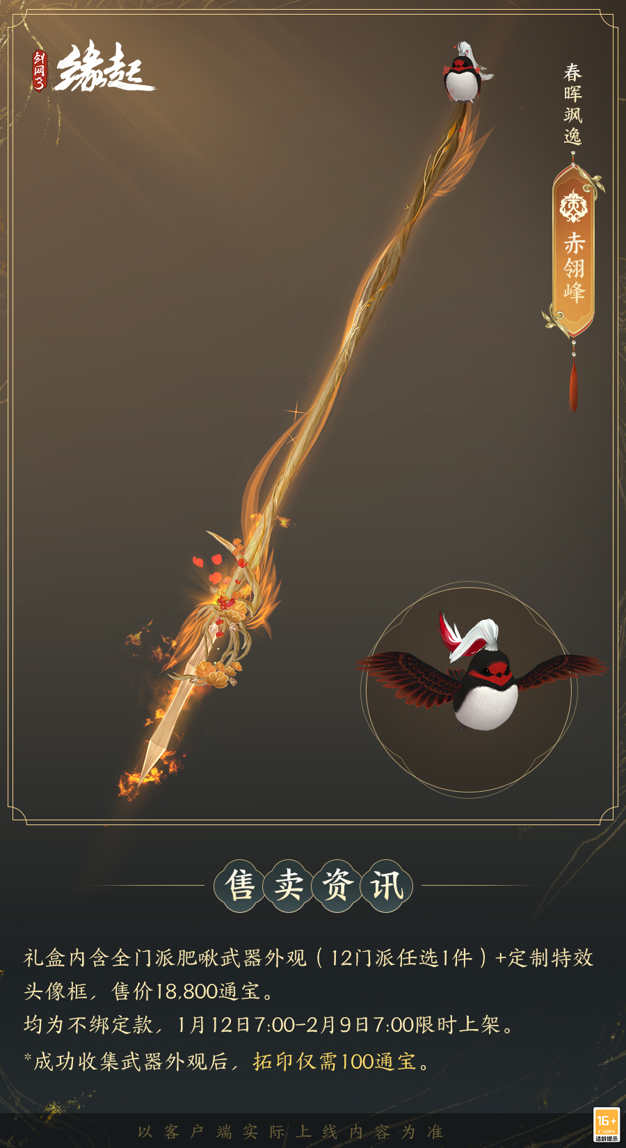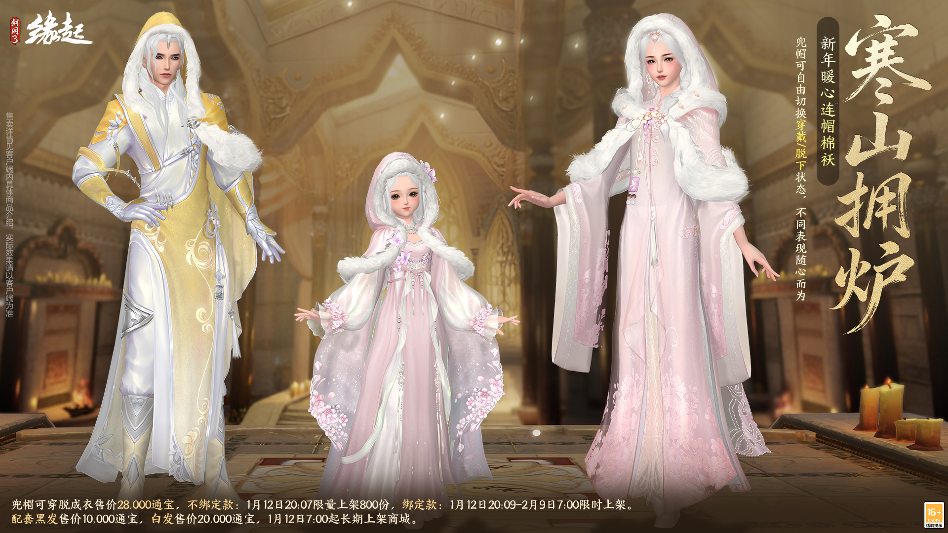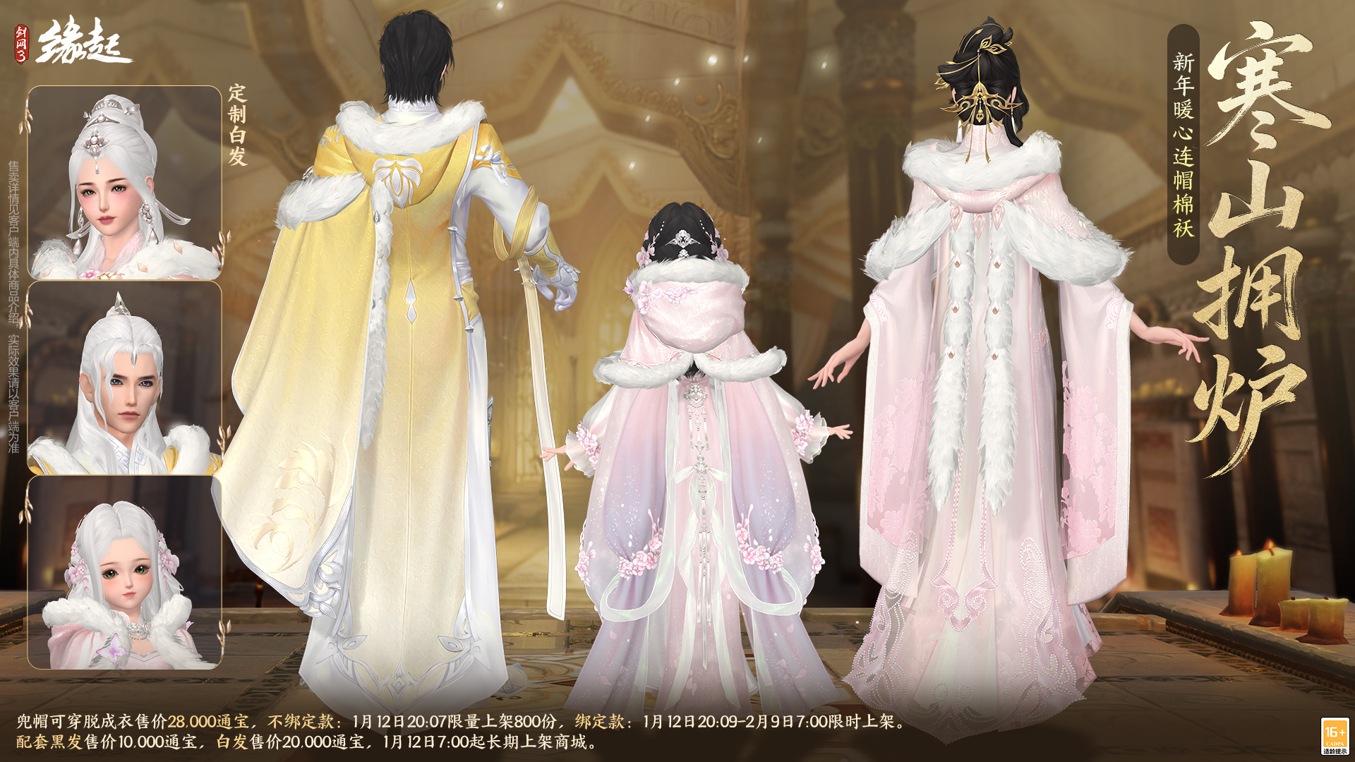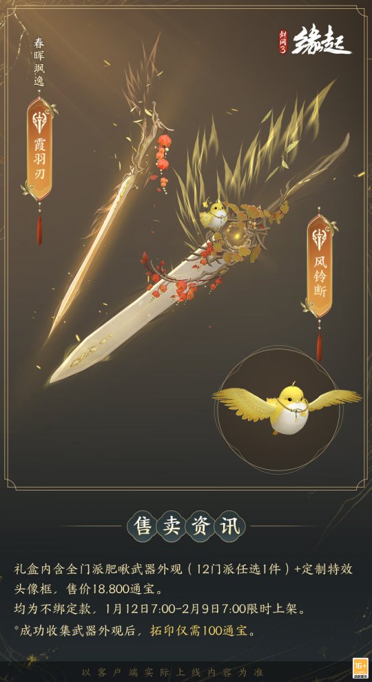 啾啾圆似栗,暖裘惬意温。《剑网3缘起》新品外观1月12日上架,夜照金鳞主题外装礼盒「坠夜流金」奢华现世墨色流金间神龙隐现,愿祥瑞伴身,祝侠士新岁如龙腾万里,步步登云。深冬凛冽,兜帽可穿脱外观「寒山拥炉」即将上架,锦衣拥炉,绒暖护身。更有肥啾灵禽啾啾,喧腾报喜,这一岁,自是满堂欢庆,热闹非凡! 新品外观实装视频一览: 夜照金鳞主题外装礼盒「坠夜流金」 流金铸骨,碎星为鳞,夜照金鳞主题外装礼盒「坠夜流金」华贵登场。 外观以深沉玄黑为主调,辅以皎洁纯白,间以斑斓金饰,流光溢彩。线条流畅,密织巧绣,织就蟒纹隐幽光,腾挪蜿蜒,蕴含无尽神秘。金链垂珠,玉佩摇响,更添几分风雅与尊贵。 成男款高冠束发,额前金冠嵌宝,彰显风范。袍身通体以金丝勾勒层层蟒纹,蜿蜒而上,鳞片交错,绽放华光。腕间佩金环,颈间悬金饰,贵气凛然。 成女款华发如瀑,金缕流苏绕鬓间。长裙墨色为底,鎏金丝线绣出层叠盘旋的鳞纹,腰间系精巧金带,垂下流苏,突显灵动。金链流环缠绕足踝,赤足轻踏,步步生莲,楚楚动人。 萝莉款左襟玄黑,右襟素白,黑白分明,衣身亦绣繁复金鳞纹样,交错有致。下裙宽摆,层次丰富,其上金丝鳞纹熠熠生辉。颈系金丝项链,腕上亦有金链缠绕,更显华贵。 成衣共有三段特效,开启后金龙盘桓,通体剔透,瑞霭腾腾,万道金芒错落。四周辉光迸溅,簌簌而落。云纹漫涌,于方寸之地,隐见扶摇直上九万里之意。 特效挂件「金乌启明」伞骨棱棱,辉光漫溢,伞面轻旋,随衣袂翻飞。细碎流金随步明灭,纷纷扬扬洒落凡尘。 售卖信息: 售价52,000通宝。 礼盒内容定制成衣、定制黑发、定制白发、定制背部挂件【金乌启明】。 不绑定款:1月12日20:05限量上架500份; 绑定款:1月12日20:09-2月9日7:00限时上架。 暖冬连帽棉袄「寒山拥炉」 红泥温酒映疏梅,暖霭拥裘散寒雪,全新连帽棉袄「寒山拥炉」携暖意登场。 衣着以厚实的毛绒滚边搭配轻盈柔顺的绸缎,整体剪裁层次分明。配色上采用了冬日暖阳般的鹅黄、似初绽梅花般的粉嫩以及拟冰雪之纯的洁白,于寒冬中透出一股融融暖意。 棉袄兜帽可随心切换穿脱效果,或随意堆叠于肩背之上,更显几分舒朗清贵;或严实罩住满头青丝,将彻骨寒气尽数挡在身外,尽享暖意融融。 成男款采用了明快的鹅黄色与素白相间,似冬日破云而出的暖阳。外披一件半袖样式的外袍,衣领高束,左臂缀有一丛丰茂的白羽绒饰,增添几分凛冽帅气。双臂至手腕包覆着紧致的护腕,线条硬朗干练。 成女款端庄温婉,周身以淡粉色为主调,几近于白,透出冰清玉洁之质。宽大的白色披肩自然向后垂落,层层叠叠的轻纱与绸缎交织,裙身修长,拖尾曳地,尽显雍容华贵。 萝莉款身着一袭粉色衫裙,色泽由襟前的浅粉渐变为裙摆的粉紫,宛若三月桃花初浸雪。颈间围有一圈厚实洁白的绒毛领,蓬松柔软。两臂袖口收束并缀以荷叶花边,显得灵动可爱。 售卖信息: 兜帽可穿脱成衣售价28,000通宝, 不绑定款:1月12日20:07限量上架800份, 绑定款:1月12日20:09-2月9日7:00限时上架。 配套黑发售价10,000通宝,白发售价20,000通宝, 1月12日7:00起长期上架商城。 武器外观礼盒「群英论武·朝光」 人歌小岁“啾”,花舞大唐春,全门派肥啾系列武器外观礼盒「群英论武·朝光」1月12日贺喜上新!礼盒内含「春晖飒逸」系列武器外观及定制特效头像框「像韵·辞花归秋」。 「春晖飒逸」武器外观流金焕彩,光尘若舞。簌簌叶刃点缀其间,朱果垂缨,累累如珠,映照霜铁寒芒锋。收集武器外观后拓印仅需100通宝! 肥啾羽翼丰润,神态闲逸,各门派各具特色。肥啾或静卧枝头,或凌空盘旋,生出几分鲜活气韵。 头像框花朵层叠绽放,花瓣舒展,疏密有致。流动光辉向右蜿蜒,飞鸟随之翩跹起舞,彰显盎然生意。 售卖信息: 「群英论武·朝光」礼盒售价18,800通宝, 内含「春晖飒逸」系列武器外观及定制特效头像框「像韵·辞花归秋」, 1月12日7:00-2月5日7:00限时上架商城,均为不绑定。 「春晖飒逸」系列武器外观成功收集后拓印仅需100通宝。 全门派肥啾头饰 群英论武,萌心相伴!全新肥啾系列头饰1月12日起长期上架商城,全民可前往花萼楼直接领取一只! 全门派肥啾根据各门派元素巧心设计,各具特色。肥啾身躯圆润,绒毛蓬松,动作轻盈,软糯可爱。 1月12日7:00-2月9日7:00,满级侠士可前往花萼楼领取肥啾任选礼盒x1,购买武器礼盒「群英论武·朝光」的侠士可额外领取肥啾任选礼盒x3! 头饰叠戴功能同步上线,同时可佩戴头饰数量提升至3个,助力侠士解锁新搭配! 售卖信息: 单只肥啾头饰售价6,000通宝,上架首周享九折特惠! 购买后绑定,1月12日7:00起长期上架商城。 月度限定外观「阳春」 阳春无留雪,玉裘锦衣香。月度限定外观「阳春」全新偏色「月」、「霜」助你冬日不惧严寒! 外观承袭盛唐华韵,剪裁疏阔大气,衣料将御寒瑞锦与阳春轻纱相融合,金饰琳琅镶嵌其问,行走间流苏摆动,贵气天成。 成男款衣领覆以雪白裘皮,毛锋饱满,自颈后向前铺开,如堆雪积玉。衣身修长,腰束革带,一侧佩戴白毛兽尾,配以层叠的金珠流苏,平添几分狂放气概。 成女款广袖宽大,袖口层层金边勾勒,雪白披帛环绕双臂。以墨灰、朱红、粉白等大胆的配色,对比鲜明,温婉动人。 萝莉款颈间围着一圈蓬松白色毛领,衬得软糯可亲。腰间系带短小,下裙呈灯笼状蓬松撑开又在底部收住,两侧垂下长长的丝绦金铃,灵动非常
