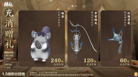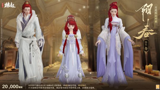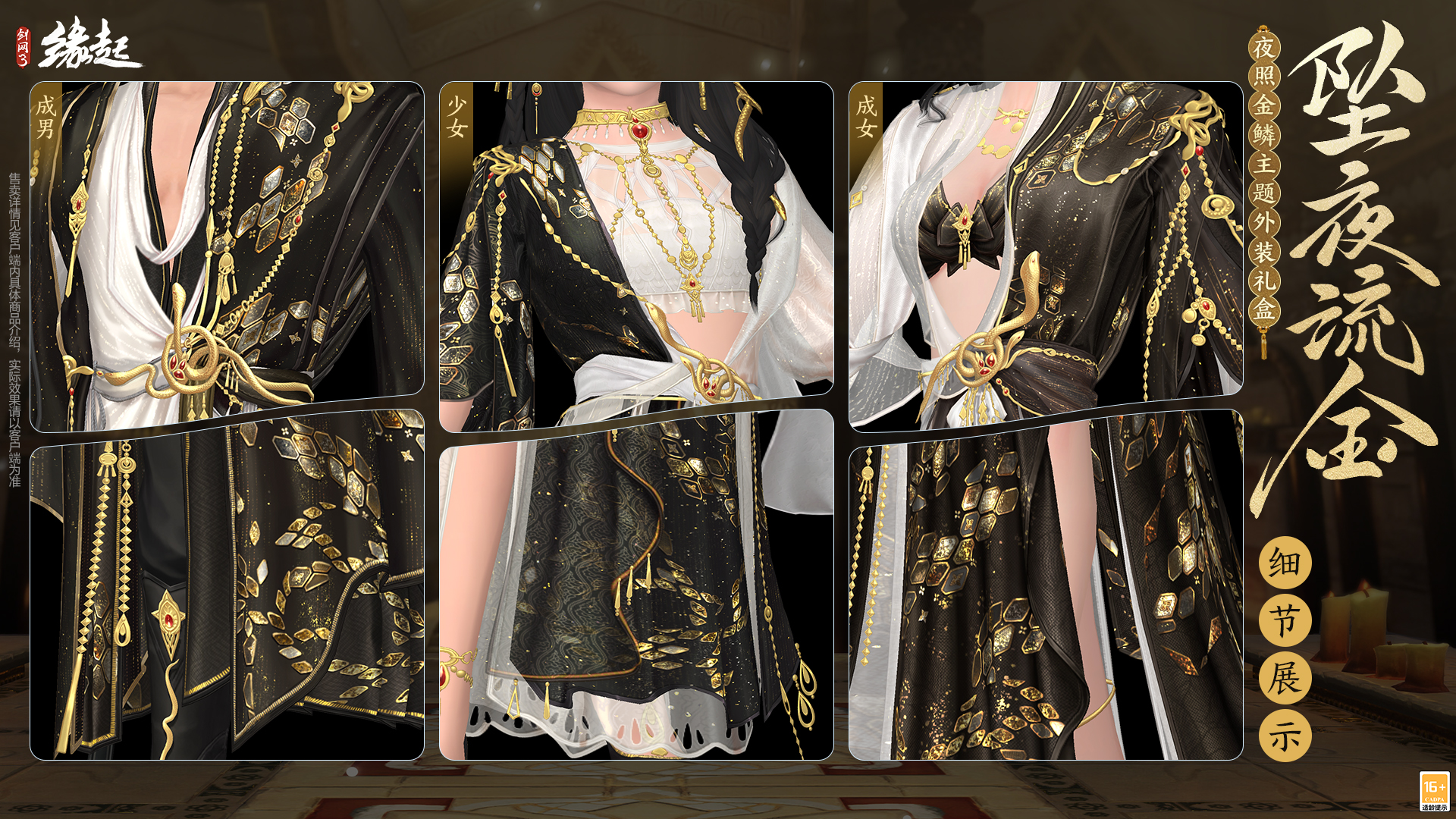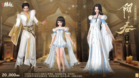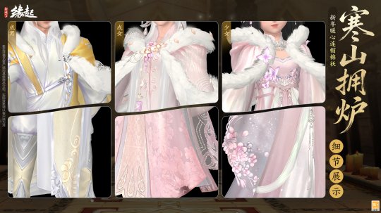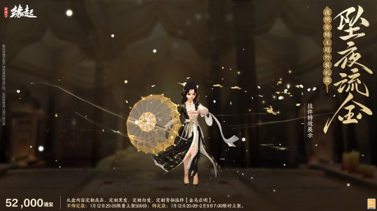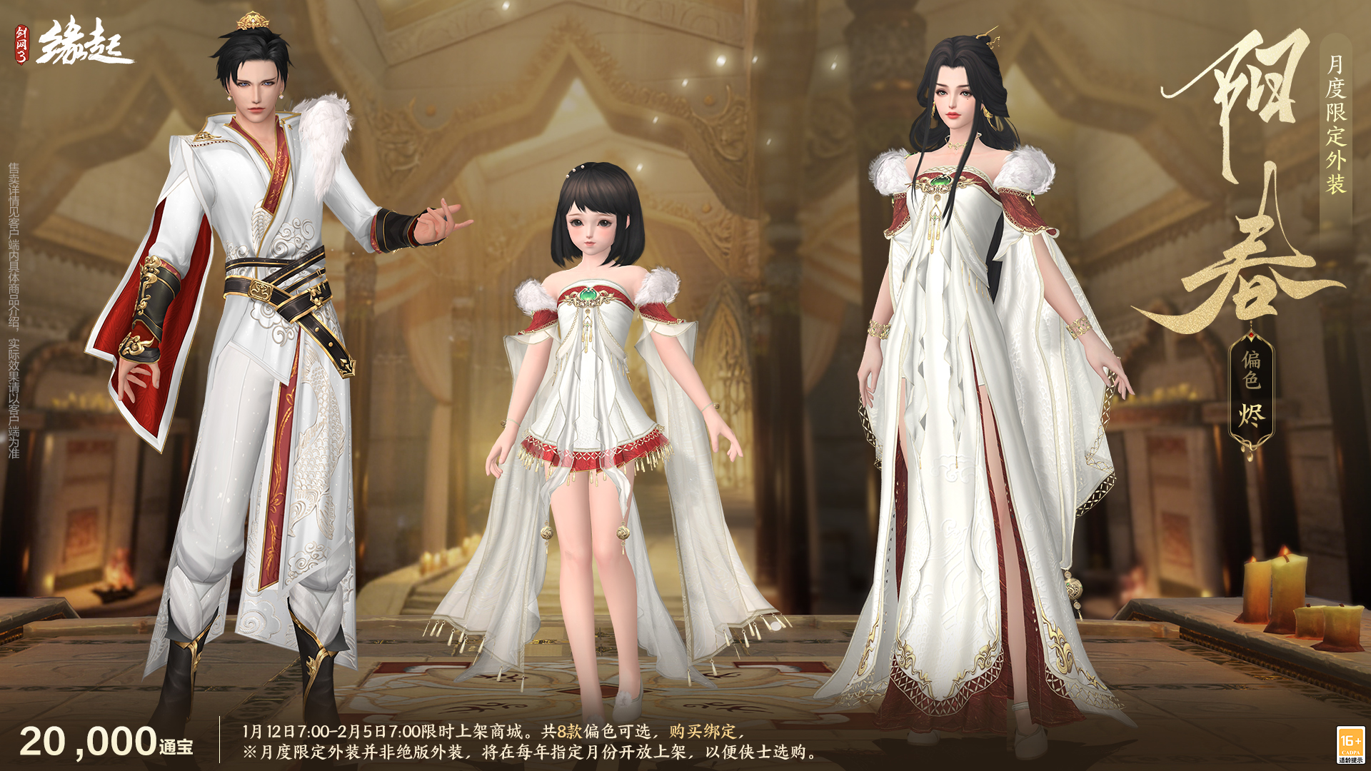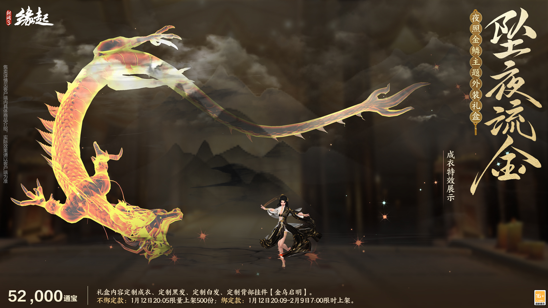啾啾圆似栗,暖裘惬意温。《剑网3缘起》新品外观1月12日上架,夜照金鳞主题外装礼盒「坠夜流金」奢华现世墨色流金间神龙隐现,愿祥瑞伴身,祝侠士新岁如龙腾万里,步步登云。深冬凛冽,兜帽可穿脱外观「寒山拥炉」即将上架,锦衣拥炉,绒暖护身。更有肥啾灵禽啾啾,喧腾报喜,这一岁,自是满堂欢庆,热闹非凡! 新品外观实装视频一览: 夜照金鳞主题外装礼盒「坠夜流金」 流金铸骨,碎星为鳞,夜照金鳞主题外装礼盒「坠夜流金」华贵登场。 外观以深沉玄黑为主调,辅以皎洁纯白,间以斑斓金饰,流光溢彩。线条流畅,密织巧绣,织就蟒纹隐幽光,腾挪蜿蜒,蕴含无尽神秘。金链垂珠,玉佩摇响,更添几分风雅与尊贵。 成男款高冠束发,额前金冠嵌宝,彰显风范。袍身通体以金丝勾勒层层蟒纹,蜿蜒而上,鳞片交错,绽放华光。腕间佩金环,颈间悬金饰,贵气凛然。 成女款华发如瀑,金缕流苏绕鬓间。长裙墨色为底,鎏金丝线绣出层叠盘旋的鳞纹,腰间系精巧金带,垂下流苏,突显灵动。金链流环缠绕足踝,赤足轻踏,步步生莲,楚楚动人。 萝莉款左襟玄黑,右襟素白,黑白分明,衣身亦绣繁复金鳞纹样,交错有致。下裙宽摆,层次丰富,其上金丝鳞纹熠熠生辉。颈系金丝项链,腕上亦有金链缠绕,更显华贵。 成衣共有三段特效,开启后金龙盘桓,通体剔透,瑞霭腾腾,万道金芒错落。四周辉光迸溅,簌簌而落。云纹漫涌,于方寸之地,隐见扶摇直上九万里之意。 特效挂件「金乌启明」伞骨棱棱,辉光漫溢,伞面轻旋,随衣袂翻飞。细碎流金随步明灭,纷纷扬扬洒落凡尘。 售卖信息: 售价52,000通宝。 礼盒内容定制成衣、定制黑发、定制白发、定制背部挂件【金乌启明】。 不绑定款:1月12日20:05限量上架500份; 绑定款:1月12日20:09-2月9日7:00限时上架。 暖冬连帽棉袄「寒山拥炉」 红泥温酒映疏梅,暖霭拥裘散寒雪,全新连帽棉袄「寒山拥炉」携暖意登场。 衣着以厚实的毛绒滚边搭配轻盈柔顺的绸缎,整体剪裁层次分明。配色上采用了冬日暖阳般的鹅黄、似初绽梅花般的粉嫩以及拟冰雪之纯的洁白,于寒冬中透出一股融融暖意。 棉袄兜帽可随心切换穿脱效果,或随意堆叠于肩背之上,更显几分舒朗清贵;或严实罩住满头青丝,将彻骨寒气尽数挡在身外,尽享暖意融融。 成男款采用了明快的鹅黄色与素白相间,似冬日破云而出的暖阳。外披一件半袖样式的外袍,衣领高束,左臂缀有一丛丰茂的白羽绒饰,增添几分凛冽帅气。双臂至手腕包覆着紧致的护腕,线条硬朗干练。 成女款端庄温婉,周身以淡粉色为主调,几近于白,透出冰清玉洁之质。宽大的白色披肩自然向后垂落,层层叠叠的轻纱与绸缎交织,裙身修长,拖尾曳地,尽显雍容华贵。 萝莉款身着一袭粉色衫裙,色泽由襟前的浅粉渐变为裙摆的粉紫,宛若三月桃花初浸雪。颈间围有一圈厚实洁白的绒毛领,蓬松柔软。两臂袖口收束并缀以荷叶花边,显得灵动可爱。 售卖信息: 兜帽可穿脱成衣售价28,000通宝, 不绑定款:1月12日20:07限量上架800份, 绑定款:1月12日20:09-2月9日7:00限时上架。 配套黑发售价10,000通宝,白发售价20,000通宝, 1月12日7:00起长期上架商城。 武器外观礼盒「群英论武·朝光」 人歌小岁“啾”,花舞大唐春,全门派肥啾系列武器外观礼盒「群英论武·朝光」1月12日贺喜上新!礼盒内含「春晖飒逸」系列武器外观及定制特效头像框「像韵·辞花归秋」。 「春晖飒逸」武器外观流金焕彩,光尘若舞。簌簌叶刃点缀其间,朱果垂缨,累累如珠,映照霜铁寒芒锋。收集武器外观后拓印仅需100通宝! 肥啾羽翼丰润,神态闲逸,各门派各具特色。肥啾或静卧枝头,或凌空盘旋,生出几分鲜活气韵。 头像框花朵层叠绽放,花瓣舒展,疏密有致。流动光辉向右蜿蜒,飞鸟随之翩跹起舞,彰显盎然生意。 售卖信息: 「群英论武·朝光」礼盒售价18,800通宝, 内含「春晖飒逸」系列武器外观及定制特效头像框「像韵·辞花归秋」, 1月12日7:00-2月5日7:00限时上架商城,均为不绑定。 「春晖飒逸」系列武器外观成功收集后拓印仅需100通宝。 全门派肥啾头饰 群英论武,萌心相伴!全新肥啾系列头饰1月12日起长期上架商城,全民可前往花萼楼直接领取一只! 全门派肥啾根据各门派元素巧心设计,各具特色。肥啾身躯圆润,绒毛蓬松,动作轻盈,软糯可爱。 1月12日7:00-2月9日7:00,满级侠士可前往花萼楼领取肥啾任选礼盒x1,购买武器礼盒「群英论武·朝光」的侠士可额外领取肥啾任选礼盒x3! 头饰叠戴功能同步上线,同时可佩戴头饰数量提升至3个,助力侠士解锁新搭配! 售卖信息: 单只肥啾头饰售价6,000通宝,上架首周享九折特惠! 购买后绑定,1月12日7:00起长期上架商城。 月度限定外观「阳春」 阳春无留雪,玉裘锦衣香。月度限定外观「阳春」全新偏色「月」、「霜」助你冬日不惧严寒! 外观承袭盛唐华韵,剪裁疏阔大气,衣料将御寒瑞锦与阳春轻纱相融合,金饰琳琅镶嵌其问,行走间流苏摆动,贵气天成。 成男款衣领覆以雪白裘皮,毛锋饱满,自颈后向前铺开,如堆雪积玉。衣身修长,腰束革带,一侧佩戴白毛兽尾,配以层叠的金珠流苏,平添几分狂放气概。 成女款广袖宽大,袖口层层金边勾勒,雪白披帛环绕双臂。以墨灰、朱红、粉白等大胆的配色,对比鲜明,温婉动人。 萝莉款颈间围着一圈蓬松白色毛领,衬得软糯可亲。腰间系带短小,下裙呈灯笼状蓬松撑开又在底部收住,两侧垂下长长的丝绦金铃,灵动非常