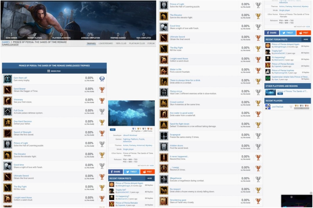 育碧备受关注的第三人称动作冒险游戏《波斯王子:时之砂》的重制版可能很快就要发布了。而这个很快有可能就是今天。 1月15日,根据粉丝账号popuniverseX的发现,《波斯王子:时之砂》重制版的网页出现了两个新文件,其中一个文件是PNG格式的,文件名很直白,直接写道“game-release-tomorrow”(游戏明天发布)。目前该网站已被关闭,但数据显示它还托管在育碧常用的法国域名注册商上。 如今该粉丝账号用于爆料的账号已被封禁以及而用于转载该消息的账号也宣布删除帖子以免被育碧安全部门盯上的举措更加证实了这一消息的真实性。 目前,《波斯王子:时之砂》重制版的官方网站与M站评分页面现已上线,该粉丝账号也挖出了游戏的全奖杯列表。由此看来,游戏说不定真的会在最近几天突然发售。 |