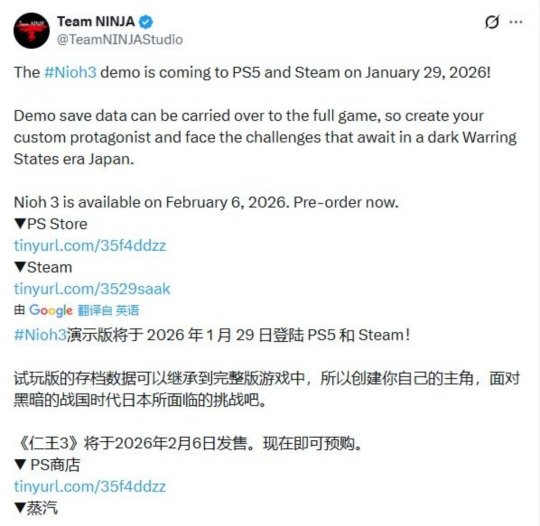 Team NINJA今日通过官方社交媒体宣布,动作角色扮演游戏《仁王3》的试玩版将于2026年1月29日登陆PlayStation5与Steam平台。 根据官方消息,试玩版的存档数据可以继承至正式版。玩家可在试玩版中创建自定义主角,提前体验背景设定于黑暗战国时代的日本所面临的挑战。 相较于前两作之间三年的开发间隔,《仁王3》将在《仁王2》发售六年后推出。据悉,本作并未保守求稳,而是在故事和游戏系统方面进行了显著革新。 其核心亮点在于,玩家首次可以在“武士”与“忍者”两种战斗风格之间进行选择,并且在整个游戏过程中可以随时切换。最终,Team NINJA确立了不同于FromSoftware“魂系”游戏的独特设计理念,旨在为硬核动作游戏爱好者带来全新的“受虐”体验。 《仁王3》的正式发售日期已确定为2026年2月6日,目前游戏已开启预购。 |