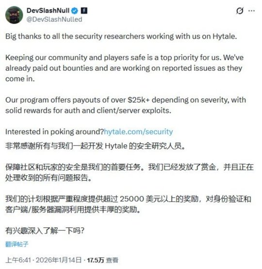 全球瞩目的沙盒游戏《Hytale》自开启早期访问后人气爆棚。据此前报道,游戏上线当天即登顶海外直播平台最多观看游戏榜首,并吸引了高达280万的同时在线玩家。 然而,与多数早期访问游戏一样,《Hytale》的首发周并非一帆风顺,游戏存在一些预期内的错误与技术问题。为确保游戏安全稳定,开发商Hytale团队近日正式推出了一项漏洞赏金计划,为发现并报告安全漏洞的玩家提供总额超过2.5万美元的奖励。 一位开发者通过社交媒体透露,该计划根据漏洞严重程度提供报酬,针对认证及客户端/服务器漏洞的赏金尤为可观。他表示,团队已支付了部分赏金,并正在持续处理玩家提交的报告。 据悉,玩家可直接向《Hytale》安全团队提交漏洞报告。一旦问题被核实并符合赏金资格,团队将进行评估并持续向报告者同步修复进展。 不过,并非所有玩家都能参与。根据官方网站的规定,赏金仅限年满18周岁的玩家领取,且所有测试必须使用玩家本人的账号进行。开发团队还制定了一系列额外规则,并鼓励玩家在提交报告前仔细阅读。 此前,团队在一篇博客文章中坦言,由于项目重启仅两个月,许多功能尚未完善,游戏初期存在“颠簸”在所难免。但他们承诺将全力以赴,确保所有玩家都能顺利体验游戏,并持续进行优化与修复。 |