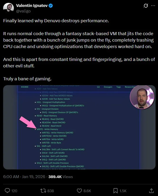 近年来,反篡改解决方案Denuvo因其对游戏性能的潜在影响而在玩家和开发者中备受争议。尽管业界长期怀疑其是导致游戏卡顿、帧率下降的元凶,但一直缺乏深入的技术剖析。近日,来自技术博主和程序员的分析,揭示了Denuvo可能损害游戏性能的内在运作机制。 根据博主Nathan Baggs的分析以及程序员@valigo在社交媒体上的佐证,Denuvo的核心工作原理是:它将游戏的部分关键代码包裹在一个自定义的虚拟机中。原本为CPU高效执行而优化编译的指令,会被转换为此虚拟机特有的指令集。 这个基于堆栈的虚拟机相当于一个软件模拟的“CPU”。在游戏运行时,虚拟机会通过即时编译技术,将转换后的指令再次编译成真实CPU能执行的代码。但在此过程中,Denuvo会引入大量无用的跳转指令和混淆代码,迫使CPU的指令流水线和分支预测器进行更多无效工作。 更关键的影响在于,游戏开发时精心优化的循环、内存访问顺序和指令排列,会被Denuvo的虚拟机打乱和重新包裹。这导致原有的优化大部分失效。同时,现代CPU高度依赖缓存和推测执行来提升效率,而Denuvo不断以非常规模式重构代码,会使CPU缓存频繁失效,从而严重拖累性能。 用通俗的话说,所有这些复杂的技术保护措施——包括定时检测、指纹识别和完整性校验——都增加了CPU的额外负担。其代价直接表现为玩家在实际游戏中遇到的加载时间变长、画面卡顿和帧率下降。 Denuvo在游戏行业内的声誉颇为复杂,许多采用它的工作室都面临玩家社区的强烈反弹,截至目前,Denuvo的创造者尚未对此次分析的具体发现做出官方正式解释。 |