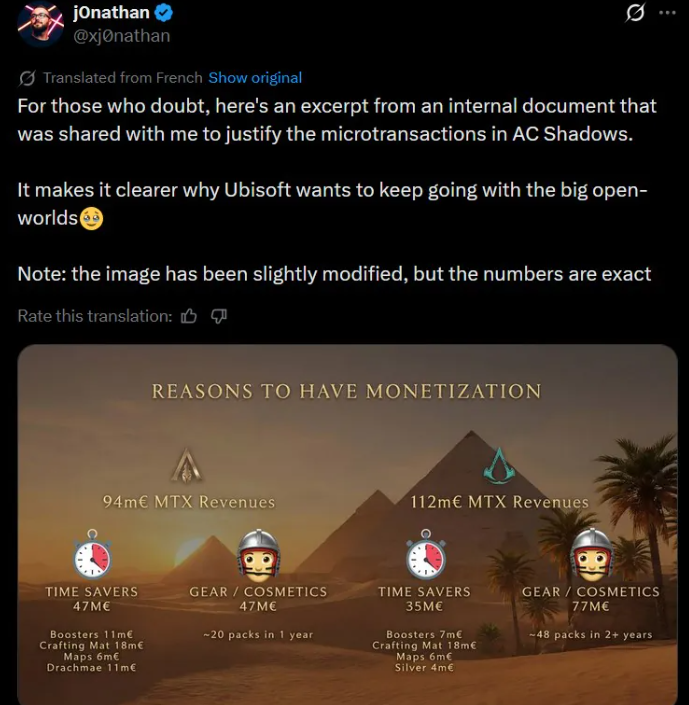 育碧公司的公众形象持续下滑已非秘密,这与其近期全面裁员、取消项目及推迟《刺客信条4:黑旗重制版》等争议举措有关。其中,在纯单机游戏《刺客信条》系列中植入微交易系统,一直是玩家与公司之间的一大矛盾焦点。近日,法国用户j0nathan泄露的内部文件,终于让我们看清了背后巨大的经济利益驱动。 泄露文件显示,育碧从《刺客信条:奥德赛》的微交易中获得了9400万欧元收入,而从《刺客信条:英灵殿》中则获得了1.12亿欧元。具体而言,玩家在《刺客信条:奥德赛》中花费了约4700万欧元购买经验加速器等节省时间的道具,在《刺客信条:英灵殿》中此类消费也达到3500万欧元。 如此规模的收入使得微交易不再是开发者可有可无的“副业”,而成为了游戏设计的首要因素之一。它深刻影响着开发团队的重大设计决策,旨在最大化微交易潜在收益。育碧近年来的RPG化《刺客信条》作品因过于“肝”(重复刷取资源)而备受批评,这些泄露文件恰恰表明,这样做有着明确的财务动机。 这同时也解释了为何在《刺客信条:影》中会引入“Animus中枢”界面。该界面将微交易深度集成至用户交互中。通过强制玩家在开始游戏前先进入Animus中枢,育碧正在进一步将微交易整合到玩家的整体游戏体验中。 |