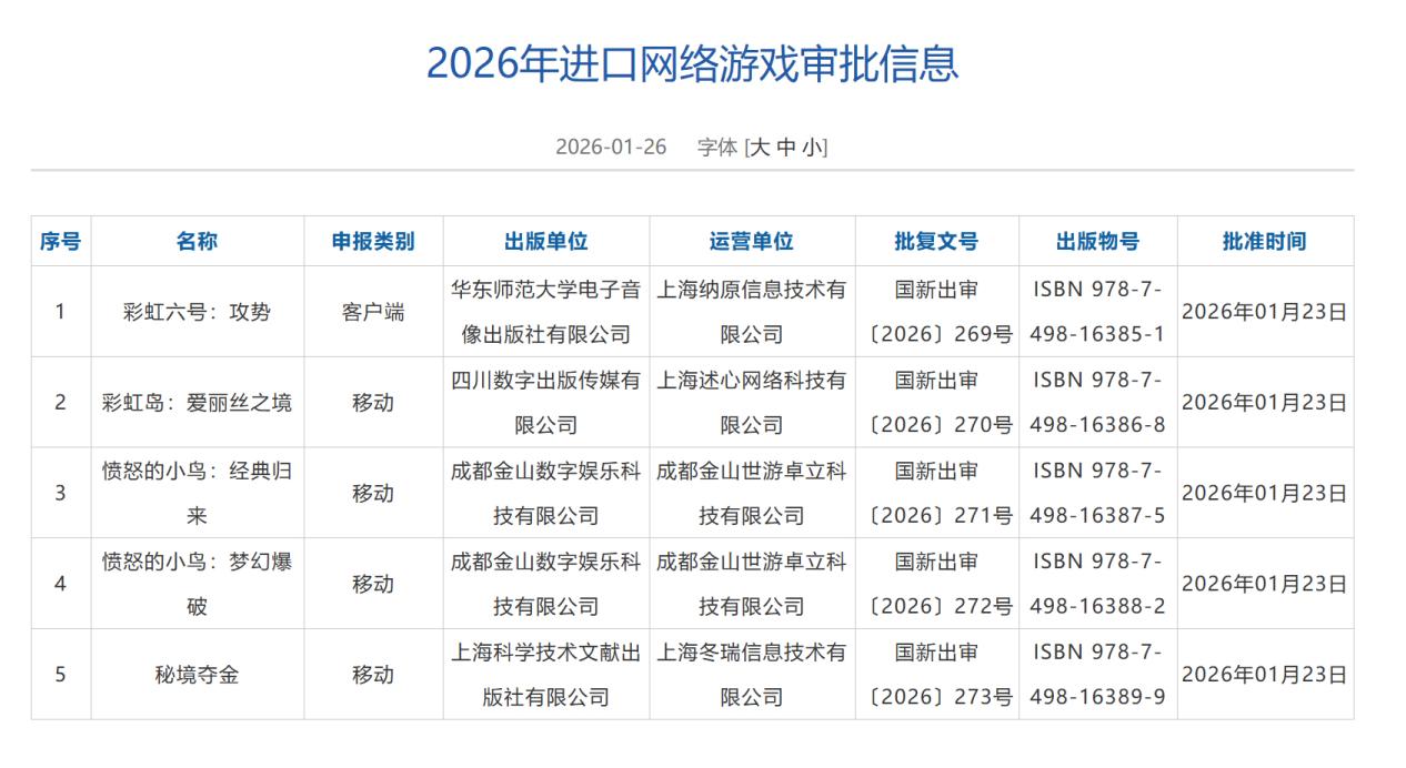 1月26日,国家资讯出版署正式发布2026年1月网络游戏审批信息,本次共177款国产网络游戏获得版号,另有7款进口网络游戏获批,同时还有14款游戏完成审批信息变更。其中值得关注的有:网易《妖妖棋》、三七互娱《斗罗大陆:启程》、巨人网络《月圆之夜:大师对弈》、四三九九《小小富翁》等。