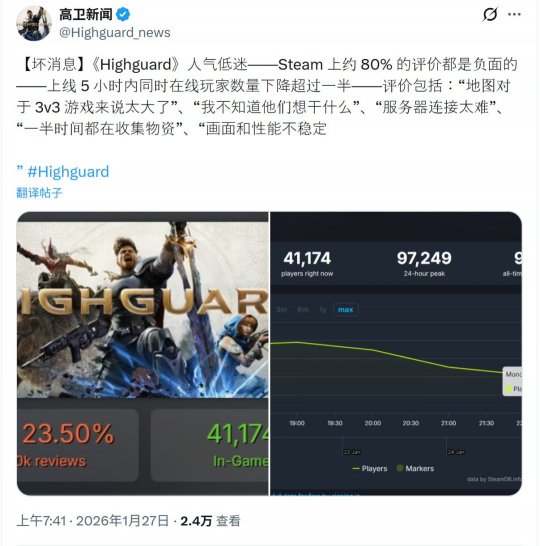 由前《泰坦陨落》开发者打造的新作《巅峰守卫》在今天正式上线Steam,但玩家评价几乎全是负面。虽然Steam同时在线玩家峰值接近10万(97249人),但玩家们却遇到了各种问题。 玩家对《巅峰守卫》最大的不满在于它的乏味感。地图很大,但3v3的模式与地图的整体风格并不相符。美术风格良莠不齐,角色也相当平庸。 此外,优化似乎也是个大问题,玩家反映即使使用RTX 5080这样的高端显卡,游戏性能也很差。总而言之,这款游戏的表现符合预期,毕竟早在TGA压轴亮相后就被玩家的口水淹没。 上线几个小时就流失了将近一半玩家: 玩家口碑也是非常糟糕,在13231篇评价中,只有24%的玩家给出好评: 《巅峰守卫》开发团队中有一些开发者来自Firewalk Studios,开发过《星鸣特攻》: 知名主播Shround吐槽很难用手柄瞄准: |