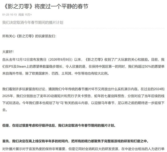 《影之刃零》看起来将成为中国游戏产业又一个里程碑式时刻。开发商S-Game透露,本作愿望单超过一半来自国外玩家。除了欧美市场,巴西,土耳其,中东也有很大比例。 《影之刃零》制作人Soulframe在微博博客“《影之刃零》将度过一个平静的春节”中透露,“自从去年12月12日宣布发售日(2026年9月9日)以来,《影之刃零》收到了广大玩家的关心和鼓励。目前,我们在PS及Steam上的愿望单数量稳步增长,令人欣喜的是,在保持中国区第一的同时,我们有超过50%的愿望单来自海外市场,除了欧美国家外,巴西,土耳其,中东等地也有较大比例。” 外媒PushSquare表示,虽然《黑神话:悟空》销量巨大,但其大部分销量来自中国,这表明《影之刃零》可能更具全球吸引力。 最新数据显示,《黑神话:悟空》的销量已超过2000万份。如果《影之刃零》能够复制这一成功,并同时吸引西方玩家,那么工作室有望打造出年度最畅销游戏之一。 |