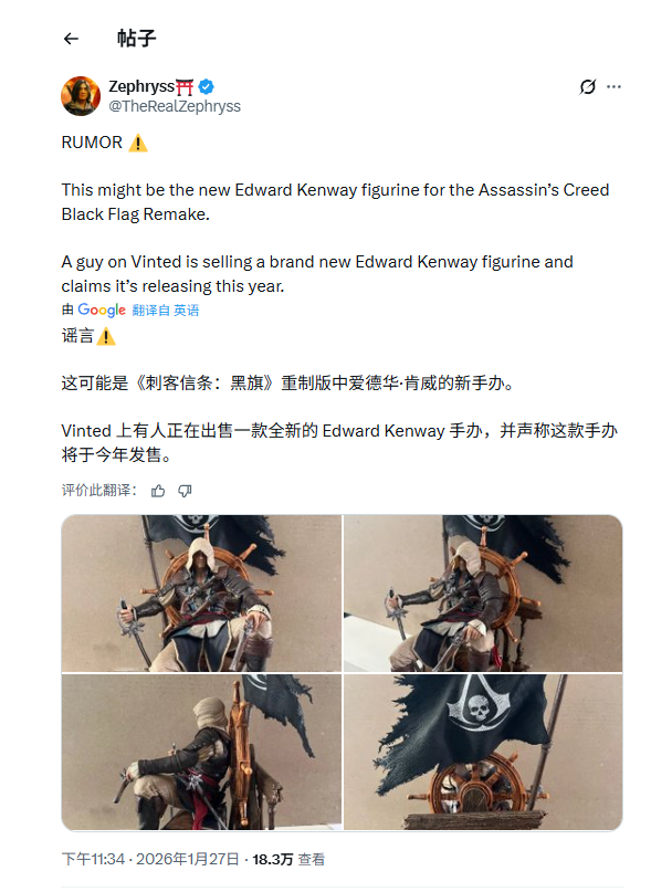 尽管游戏行业中泄密事件屡见不鲜,但一款尚未官宣的作品被大量曝光、甚至引发发行商公开回应的情况仍较为少见。近期,围绕《刺客信条4:黑旗》重制版的相关传闻持续发酵,育碧也对最新一次爆料作出了间接回应。 本周,一款疑似与《刺客信条4:黑旗》重制版相关的爱德华·肯威手办在网络上流传,并迅速在社交平台上传播。随后,《刺客信条》官方账号在社交媒体上发布了一张《侠盗猎车手:圣安地列斯》中CJ的经典台词截图“啊,见鬼,又来了”,被外界普遍解读为对相关传闻的回应。 目前,育碧尚未正式公布《刺客信条4:黑旗》重制版的具体信息。不过,此前PEGI的一次泄露显示,该项目的名称可能为《刺客信条:黑旗Resynced》。此外,去年夏天,手办制造商PureArts曾在一次直播中提及一款与该重制版相关的肯威手办,当时该游戏尚未对外公布。 据悉,近日流出的手办最早出现在欧洲二手交易平台Vinted。内容创作者Ubicypher随后与卖家取得联系,并获得了该手办由PureArts制作的相关证明。该手办最终以约400欧元(约合480美元)的价格售出,目前相关商品页面已下架。 此前有消息称,《刺客信条:黑旗》重制版原计划在较近时间内发售,但该项目可能已受到育碧近期“重大调整”计划的影响,被纳入延期名单之中。截至目前,育碧尚未就该作的发售窗口或项目状态作出正式说明。 《刺客信条:黑旗》重制版仍处于未官宣状态,更多信息有待育碧后续公布。 |