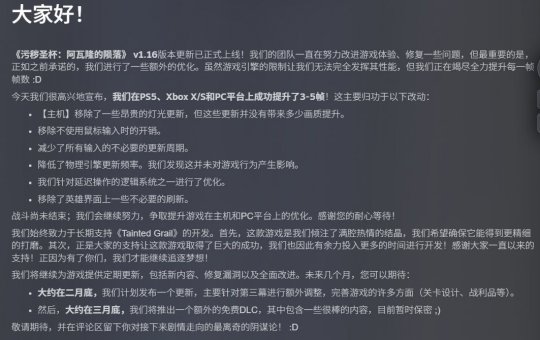 波兰游戏工作室Awaken Realms为动作角色扮演游戏《污痕圣杯:阿瓦隆的陨落》发布了全新补丁,重点提升了游戏的技术表现。此次更新的主要成果是显著的性能优化:在PC、PlayStation 5和Xbox Series平台上,玩家平均获得了3-5帧的性能提升。 为实现这一改进,开发团队部分简化了光照系统并重构了内部更新循环,但对游戏视觉完整性的影响微乎其微。工作室称性能优化工作远未结束,团队计划定期发布包含游戏改进、错误修复以及全新内容的更新补丁。故事战役第三幕的大型更新将于今年2月推出。而到了三月底,将有免费DLC等待着玩家。 《污痕圣杯:阿瓦隆的陨落》是对亚瑟王传说的黑暗重构。该作于2023年开启抢先体验,2025年5月正式发售。去年12月,工作室推出的付费DLC《萨拉斯圣所》获得了玩家社区的好评。据工作室数据显示,游戏累计销量已突破一百万份,印证了市场对这款作品及其发展方向的持续关注。 截图欣赏: |