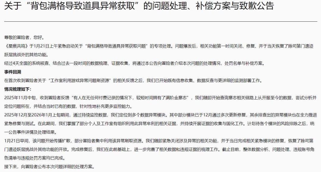 一切要从1月19日,一位《星痕共鸣》的主播开播说起。 世界观:游戏故事发生在雷格纳斯大陆,这里曾由 “星元” 能量维系平衡,神族与凡人共同生活。但 “循环失衡” 灾难后,神族移居他界,星元紊乱,“虚蚀” 腐化力量滋生,人类面临魔物和神秘组织的威胁。玩家作为 “共鸣者”,需收集 “星痕” 碎片,恢复星元平衡。 游戏特色 无角色抽取:游戏内无角色抽取机制,玩家无需花费时间和精力去抽卡获取角色。 轻松养成:每日只需 30 分钟即可获取资源,告别爆肝压力,让玩家轻松冒险不掉队。 丰富职业:有 8 大基础职业,每个职业拥有 2 种专属流派,共 16 种职业分支,玩家可通过切换武器随时变更职业,实现多维度战术组合。 动漫捏脸:特创动漫捏脸系统,支持 127 项部位调节和 250 部件全域染色,还新增表情、动作编辑器,可打造独一无二的专属形象,还原动漫名场面。 知名声优:松冈祯丞、佐藤利奈、川澄绫子等知名声优倾情献声,带来动漫番剧般的沉浸叙事体验。 特色副本:动漫副本升级,开放更多大型团本,玩家可与朋友一起组队挑战。 家园社交:家园编辑器上线,玩家可以和朋友在虚拟家园中聚会互动。 《星痕共鸣》是去年7月公测的一款mmo二游,与《蓝色协议》颇有渊源,具体不谈了。主要玩法是非常传统的组队下本刷装备,所以很多主播也会直播打本。19日,主播开播上了一位水友的号打本,打开背包后,水友账号上的时装数量引起了很多玩家的注意。 但慢慢地,直播间的话题就从水友账号欧不欧扩散到了可以利用bug获取时装上:《星痕共鸣》既然是mmo,那时装肯定是游戏的一个重要的盈利途径。这游戏里的时装获取是需要抽卡的,并且存在80保底机制,一抽的价格大概是15。但只需要在抽卡之前利用其他道具把背包填满,只留下一个格子给时装,这样的话在之后每一抽,只要不是时装,系统都会提示玩家背包已满,抽卡就是无效的。但如果抽到的是时装,由于背包格子中,同样的材料可以叠加,时装则可以被成功获取。相当于每次单抽都能出金,不仅时装可以通过这种方式获取,意志扭蛋(制作额外技能的道具,和时装获取规则一致)同样也能,这让每次保底吃满的氪佬怎么能接受。 回看游戏的宣传语,原来这游戏真的没骗人。 而在主播下号之后,号主本人又在游戏中的世界频道发表了更精彩的言论: 甚至这位水友还曾经有过想以教人卡bug为由招人进工会,结果根本没人信。 更离谱的是,很多玩家表示这个bug从开服起就已经存在了。并且,根据官方后来的公告来看,有玩家在去年11月的时候就反馈过这个bug,官方倒是有说会处理,但是直到这次事件之前,进展居然为零耶。 好家伙,这下知道为什么这bug为什么能从开服坚挺到现在了,一是玩家根本没人信,二是官方根本没人管,某种意义上算是双向奔赴了。然而这次被爆后不到半天就处理好了困扰官方三个月的bug,这是为什么呢好难猜呀。 真是全靠同行衬托了,“真投入”如今也能上桌吃饭了。 随后,官方终于发布了相关处理结果以及补偿方式,称会对涉及相关操作的账号进行不同时长的封禁,其他玩家也会收到一定的补偿。 本来玩家都打算等石头人被削了再打,这下好了,石头人不用打了,游戏也不用打了。 |