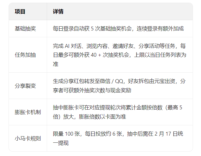 腾讯百度又撒钱春节红包,这次是引流AI产品,用户买账吗? 活动时间:预约期 1 月 25 日 - 1 月 31 日;正式期 2 月 1 日 0 时至 2 月 17 日;主会场分 3 轮,每轮对应固定提现节点。 参与门槛:元宝 App 需更新至 2.55.0 及以上版本;支持微信 / QQ 账号登录,提现需微信实名认证,无额外门槛。 奖池构成:总金额 10 亿元,含随机现金红包、可转发分享红包、限量 100 张价值 1 万元的现金小马卡、红包膨胀卡(最高 5 倍)、惊喜权益(如 QQ 音乐绿钻、外卖券)。 预约奖励:1 月 25 日起在 App 首页点击 “春节分 10 亿” 预约,2 月 1 日可额外获 10 次抽奖机会。 腾讯“撒钱”为元宝,百度“撒钱”为文心。 1月26日,腾讯董事会主席马化腾在公司年会上的一番表态,让整个互联网圈瞬间沸腾。这位掌舵人明确将2025年定为“AI大年”,并表示旗下AI应用“元宝”将于2月1日启动春节期间瓜分10亿元现金活动。 马化腾也毫不掩饰野心,希望通过这场高额补贴,重现当年微信红包“摇一摇”绑定数亿用户的盛况。 而更早一天,1月25日晚,百度正式发布文心助手春节现金红包活动公告,自1月26日起至3月12日,用户在百度App内使用文心助手,即可参与活动瓜分5亿现金红包,单个用户最高可获1万元奖励。 与此同时,百度App还成为《2026北京广播电视台春节联欢晚会》的首席AI合作伙伴。 一时间,市场议论纷纷。这是否预示着新一轮“微信红包式”颠覆的开端?AI时代会因此加速到来吗? 十年前,微信红包“摇一摇”,一战改写了中国互联网的支付格局,但那只是移动互联网在特定爆发前夜所改变支付习惯的变革模式,借助春节期间实现难以复制的历史。 如今,当各大厂将同样的剧本套用在AI产品上时,他们忽略了一个基本事实,那便是用户早已“红包疲劳”,而AI还远未准备好成为下一个“微信支付”。 祝福语红包:活动期间官方通过多渠道下发口令,在 “问元宝” 对话框输入指定祝福语,有机会触发 188 元、888 元等大额红包。 限时红包雨:App 内不定期开启,点击即可领取现金红包,具体时段以当日通知为准。 新用户福利:首抽保底 8.8 元,老用户邀请新用户双方可获额外抽奖机会。 |