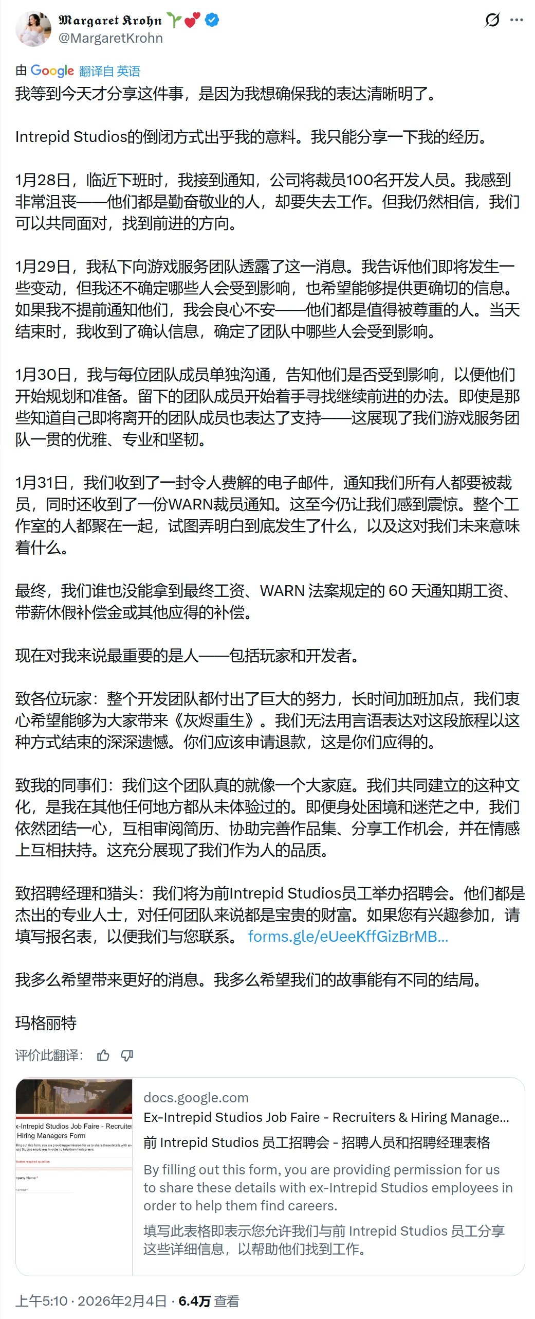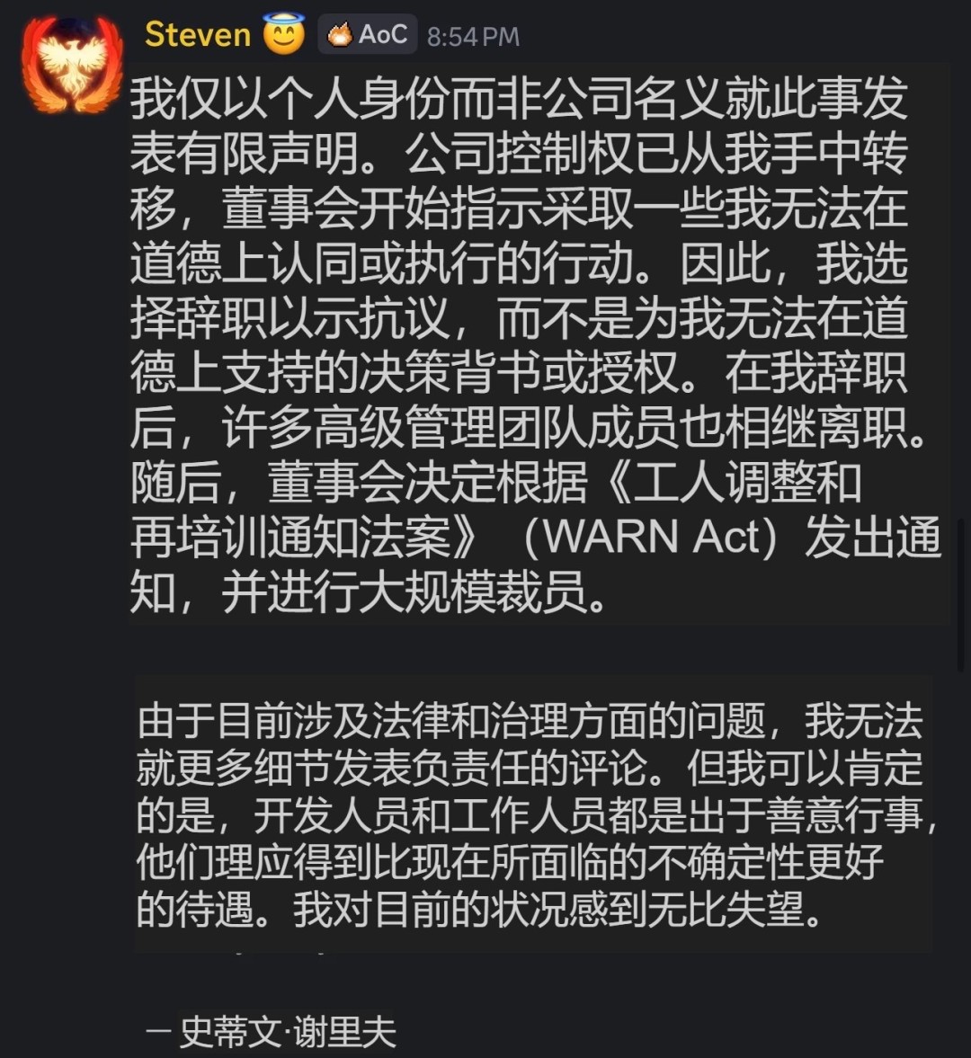 曾备受期待的MMORPG《创世灰烬》(Ashes of Creation)及其开发商Intrepid Studios,近日陷入全面崩溃的危机。 自2026年2月2日起,《创世灰烬》已无法通过Steam平台购买,新玩家无法再获取这款尚处“抢先体验”阶段的作品。更引人注目的是,在SteamDB的页面信息中,该游戏已被标记为“游戏已取消”。尽管现有玩家暂时仍可登录服务器,但外界普遍认为这一状态不会持续太久。 危机的开端是多名Intrepid Studios员工在LinkedIn上发布求职贴。其中,前通讯总监玛格丽特·克罗恩证实:“所有人都被解雇了。这太糟糕了。”随后,公司创始人兼《创世灰烬》创意总监史蒂文·谢里夫在游戏社区上发布声明,称公司的控制权已从他手中转移,董事会采取了其“在道德上无法同意或执行”的行动,因此他选择辞职抗议。其离职引发了核心领导团队的集体出走,董事会随后决定依据《WARN法案》启动大规模裁员。 内部沟通记录显示,本次裁员为“全部且永久性的工厂关闭”,且原定于2月1日发放的薪资将因公司财务状况无法支付,这意味着被裁员工将无法获得最后的薪酬,可能引发后续法律诉讼。 在经历近十年开发后,游戏于一个月前以“抢先体验”状态登陆Steam。据估算,约有31.9万名玩家购买了游戏,总金额约达1400万美元。如今项目突然停摆,大量玩家在社区中表达愤怒,质疑其为“拉高出货骗局”,并讨论发起集体诉讼寻求退款。 值得关注的是,有玩家发现该项目在Kickstarter上的众筹条款曾写明:“如果游戏未在Steam上发布,将向所有支持者全额退款。”而游戏事实上已登陆Steam,该退款条款因此失效,这引发了社区的进一步质疑。 目前,关于公司控制权变更的具体原因、资金去向以及项目的最终命运,仍有大量未解之谜。《创世灰烬》的未来,正被前所未有的不确定性所笼罩。 |