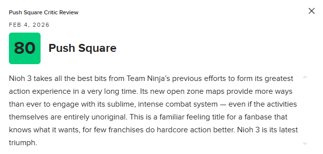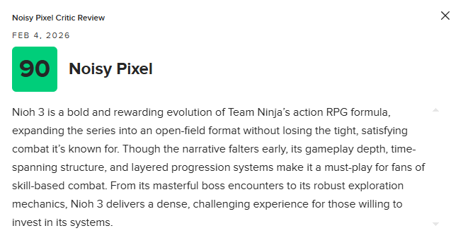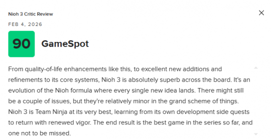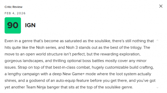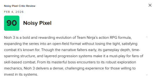 《仁王3》将于2月6日正式发售。近日,本作的媒体评分也已解禁。截至目前,《仁王3》M站媒体均分为86分,共收录72家媒体。其中,IGN给出了9分的好评。 以下为部分媒体评价: IGN 90分: 即便是在已经高度饱和的类魂游戏领域,依然没有哪一款能带来像《仁王》系列这样的独特体验,而《仁王3》更是整个三部曲中表现最出色的一作。转向开放世界结构并非尽善尽美,但丰厚的探索回报、惊艳的景观设计,以及令人热血沸腾的可选Boss战,基本掩盖了这些小瑕疵。再加上业界顶级的战斗系统、自由度极高的配装与Build构筑、一段内容扎实且篇幅可观的主线流程、真正让刷装备系统大放异彩的深度新周目模式,以及在此之前就能拯救玩家体验的自动装备功能,《仁王3》无疑又是忍者组的一次神作输出,稳稳站在类魂游戏的巅峰位置。 GameSpot 90分: 从这类贴心的便利性改进,到核心系统层面出色的新内容与精细打磨,《仁王3》几乎在各个方面都堪称卓越。这是对《仁王》公式的一次全面进化,每一个新增想法都精准落地、效果显著。或许仍存在少量问题,但放在整体体验中都只是无关痛痒的小瑕疵。《仁王3》展现了忍者组的巅峰水准——他们从过往开发历程中的“支线任务”里吸取经验,以焕然一新的姿态强势回归。最终呈现出的,是系列迄今为止最出色的一作,也是绝对不容错过的佳作。 Noisy Pixel 90分: 《仁王3》是忍者组动作RPG公式一次大胆且回报丰厚的进化,在拓展为开放式大地图结构的同时,依然保留了系列标志性的紧凑而爽快的战斗体验。尽管剧情在前期略显乏力,但其深度十足的玩法设计、跨越时间的结构构思,以及层层递进的成长系统,使其成为所有偏爱技术向战斗玩家的必玩之作。从堪称教科书级的Boss战,到扎实而丰富的探索机制,《仁王3》为愿意投入并钻研其系统的玩家,提供了一场内容密集、挑战性十足的硬核体验。 Push Square?80分: 《仁王3》汇集了忍者组过往作品中最出色的元素,打造出他们多年来最顶级的一次动作体验。全新的开放区域地图,为玩家提供了前所未有的多样方式来融入其精妙而高强度的战斗系统——尽管其中的活动设计本身并不新颖。对于清楚自己想要什么的老玩家来说,这是一部熟悉却依旧令人满足的作品,毕竟很少有系列能把硬核动作做得如此出色。《仁王3》正是忍者组最新、也是又一次的成功之作。 |