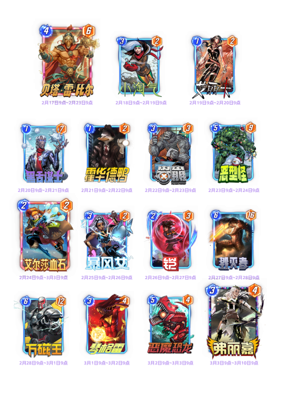 2026年2月5日,《漫威终极逆转》S19赛季「蜘蛛混乱」震撼登场!新赛季适逢新春福利大版本,为将探员呈上海量全新内容,精彩活动眼花缭乱,更有赛季通行证、全新赛季卡牌和卡包、战场外观、区域和图鉴等。 【赛季通行证】蜘蛛朋克登场 购买【蜘蛛混乱】赛季通行证,就可以获得全新的角色「蜘蛛朋克」。随着通行证等级的提升,还可以解锁全新变体、头像、卡背和其他资源。 另外,购买超高级赛季通行证,即可获得「人形蜘蛛」变体,得到变体时会同步获得基础卡。 对于没有购买超高级赛季通行证的探员,「人形蜘蛛」的基础卡可以通过合成或SNAPPACKS获得。 「蜘蛛朋克」 [3/3] 你可移动此牌1次。当其移动至另一区域时,从该区域战力最高的敌方牌中偷取2战力。 「人形蜘蛛」变体 [5/1] 揭示:将你放置的上一张卡牌合并到此牌。当此牌合并时,使其战力翻倍。 【赛季新卡】全新卡牌每周限时登场 系列5新卡 系列5赛季全新卡牌可以在终极宝库、SNAPPACKS、合成获得。 1.第一周 2月5日9点~2月12日9点 「以西结·西姆斯」终极卡包 [2/2] 你在此处放置了1张更高战力的卡牌后,此牌战力+2并移动至另一区域。。 2.第二周 2月12日9点~2月19日9点 「徘徊者」终极卡包 [3/4] 揭示:将2张窃贼的工具添加到你的手牌。如果有卡牌在上回合移动过,将这些工具的能量消耗设为0。 飞行束带 揭示:使你在此区域战力最高的卡牌战力+1,并将其向右移动一个区域。 遥控地雷 揭示:使此区域战力最高的2张敌方牌战力-2。 高频震击手套 揭示:使你在此区域战力最高的卡牌战力+2。你在下回合能量+1。 3.第三周 2月19日9点~2月26日9点 「究极蜘蛛侠」终极卡包 [3/5] 每回合开始时,若你在场上已揭示的卡牌中,有卡牌提升过战力,你的能量+1。 4.第四周 2月26日9点~3月5日9点 「暗影蜘蛛侠」终极卡包 [4/4] 揭示:将你卡组最上方的卡牌战力设为8。如果你在场上已揭示的其他卡牌总能量消耗恰好为8,则将其添加至此区域。 系列4新卡 系列4新卡会在赛季开始时全部开放。可以通过SNAPPACKS、合成定向获得;终极宝库中抽到系列4卡牌时也有概率获得新卡。 「蜘丝飞行」 [1/0] 揭示:下一回合,可以将你在此区域的1张卡牌移走。 「震耳和弦」 [1/0] 揭示:使此区域1张能量消耗不高于3的敌方角色牌战力-1,并移除其卡面文字。 「变色龙」 [3/3] 揭示:复制你本回合在此区域揭示过的另一张卡牌的文字。 【往期UP】时空卡包限时返场 1.第一周 2月5日9点~2月12日9点 「红翼」&「苏尔特尔」时空卡包 「红翼」[3/5] 此牌首次移动后,随机将1张角色牌从你的手牌中添加到原区域,你可再各移动他们1次。 「苏尔特尔」[3/5] 你每放置1张战力为10或更高的卡牌后,此牌战力+2。 * 如果没有基础卡,在得到变体的时候会自动获得。 2.第二周 2月12日9点~2月19日9点 「潘妮·帕克」时空卡包 [2/1] 揭示:添加SP//dr到你的手牌。当此牌合并时,将1张随机蜘蛛侠添加进手牌,使该牌能量消耗-3。 注意:潘妮·帕克 能够召唤的蜘蛛侠伙伴会随着赛季新卡开放而更新!快试试现在能召唤出哪些伙伴吧 SP//dr [3/3] 揭示:将此牌合并到你在此区域的另一张牌中。你下回合可以移动那张卡牌。 * 如果没有基础卡,在得到变体的时候会自动获得。 3.第三周 2月19日9点~2月26日9点 「九头蛇践踏者」&「卡特队长」时空卡包 「九头蛇践踏者」[3/2] 持续:本局对战中你的卡牌每移动一次,此牌战力+1。 「卡特队长」[3/2] 持续:将此卡牌战力添加到此区域的后排卡牌。(无法加给自身) * 如果没有基础卡,在得到变体的时候会自动获得。 4.第四周 2月26日9点~3月5日9点 「艾利奥斯」时空卡包 [6/8] 揭示:移除此区域中所有未揭开的敌方角色牌文字。 * 如果没有基础卡,在得到变体的时候会自动获得。 【战场外观】 星空迷航:贺新春 使用【高级星空币】即可开启探索,当你集齐了当期的「战场背景」,「区域外框」,「头像框和名称栏」和「能量球」4个战场外观后,你将直接获得整个星盘上剩余的所有道具奖励(整个星盘总计有15000星尘徽章、16000点数和12个高级边框等奖励)。 除此之外集齐当前大奖还可以增加奖励加成(强化因子、联盟任务积分和限时任务加成)。 暗巷2099通行证·复刻 这是个复刻的通行证,如果你已经拥有暗巷2099战场外观,则大奖会变为5个高级星空币。 完成通行证任务提升通行证等级,解锁【星尘徽章】和【高级星空币】等奖励,若您选择购买通行证,更能解锁 Mega 分离因子、战场背景等专属奖励。 【星尘徽章】可以兑换【高级星空币】、名称栏、高级神秘变体、神秘变体、Mega分离因子和边框等奖励。 【限时模式】 1.观察者模式 活动时间:2026年2月12日9点 ~ 2026年3月5日9点 回看天梯上的精彩对局,根据双方的场上局势与手牌信息,试着预判战局走向。下注并验证自己猜想的同时,观察对局双方的实际决策,从中学习高手的神来之笔,也警惕那些看似不起眼却可能逆转胜负的失误。通过代入对局、换位思考,不断吸收他人的思路与经验,让自己的水平在观摩中悄然提升。 玩法简介 1.观看对战录像 2.在录像播放到第四回合后,就可以开始预测最后胜利的一方 3.点击录像中的【金方】可进行加倍 4.消耗【金方】可查看一方玩家的手牌 5.最后选择你看好的探员,预测成功后,就可以获得【金方】和【观测币】;如果预测失败,则会失去【金方】,但也可以