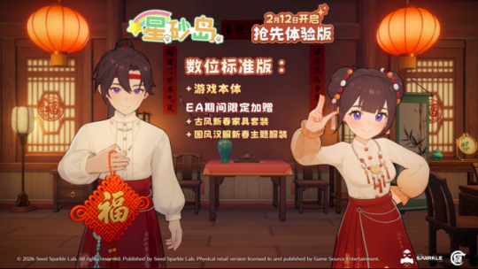 由SeedSparkleLab开发的治愈系中式田园生活模拟游戏《星砂岛》(StarsandIsland),于2026台北国际电玩展参展活动圆满成功。为回馈玩家的热烈回响,官方正式公布游戏将于 2026 年 2 月 12 日北京时间凌晨1时起(春节前夕)登陆 Steam 平台开启抢先体验(Early Access),并同步揭晓豪华首发特典。 治愈系中式田园生活模拟游戏《星砂岛》于2026台北电玩节(TaipeiGameShow)完美落幕。诚挚感谢所有亲临现场试玩、给予回馈与支持的玩家朋友,正是这份热情,成为团队持续打磨作品的重要动力。 抢先体验版本2月12日正式登陆Steam 推出特别首发优惠价格及福利 随着台北电玩节画下圆满句点,Seed Sparkle Lab 也正式宣布《星砂岛》将于 2026 年2月12日,农历春节前夕,在Steam平台同步开启抢先体验(Early Access),邀请全球玩家一同登上星砂岛,在温馨的中式田园中迎接新春的到来。为庆祝EA开启与新春佳节,《星砂岛》将于抢先体验期间推出特别首发优惠价格,并为EA玩家准备多项限定内容,期望与玩家携手展开这段共同成长的田园旅程。 本次抢先体验版本将提供两种贩卖方案: 标准版 包含游戏本体,以及特别附赠「新春华服套装」与「雅致中式家具组件」。华服设计汲取山水画的写意之美,融合新春喜庆元素;中式家具套组则细致还原传统厅堂与居室风格,从窗框雕花到床榻陈设,让玩家在自由打造家园的同时,沉浸于浓郁的新春气息。 豪华版 包含游戏本体,完整收录标准版内容与新春特典外,另独家追加「欧式古典扩展包」,包含欧式家具套装、典雅礼服,以及充满童话气息的南瓜马车,为玩家带来更多元、自由的田园风格选择。 Seed Sparkle Lab 表示,抢先体验阶段是《星砂岛》与核心社群共同成长的重要时期。团队将持续倾听玩家回馈,优先强化游戏稳定性、丰富玩法内容,并进一步完善「和谐共生」的田园生态体验,每一份建议都将成为游戏进化的关键。 公开核心玩法亮点 打造多维度的治愈体验 在本次EA阶段,《星砂岛》将开放一系列精心打造的核心玩法,为玩家呈现一个多维度的治愈田园: 1. 唯美风景与 DIY 系统: 在绘本般的海岛中,利用高度自由的建筑组件,随心打造从中式家庭到欧式庄园的梦想家园。 2. 深度 NPC 与宠物羁绊: 与众多拥有独立故事与性格的小岛居民相遇,解锁专属故事线与亲密羁绊,并在各色可爱宠物的陪伴下告别孤独。 3. 文化感官飨宴: 体验音乐演奏玩法与民族舞蹈动作(含双人互动),展现深厚的文化韵味。 4. 惊喜跨界联动: 除了已公开的《波西亚时光》角色联动及「岳阳楼」景观复刻,EA 版本将引入更多神秘联动角色。 《星砂岛》自曝光以来,凭借其独特的中式美学、深度耦合的田园生活系统与温暖治愈的基调,在全球玩家小区中积累了极高人气。这个春节,不妨暂别喧嚣,在《星砂岛》的悠然四季与烟火人情中,找到属于自己的一份宁静与治愈。 《星砂岛》是由Seed Sparkle Lab自研自发的一款治癒系模拟经营游戏, 并由Game Source Entertainment(GSE)于PlayStation 5 和Nintendo Switch 2。 官方旗舰店登陆天猫购物平台 GSE官方旗舰店现已正式登陆天猫!店内出售多款由GSE独家发行/代理的Nintendo Switch、Nintendo Switch2 及 PlayStation 实体版游戏、Xbox Series游戏主机、各款游戏配件及周边商品,玩家更可率先预购即将推出的新游戏,享受最全面、最方便、最快捷的购物体验。旗舰店将不定时推出限定优惠,包括消费折扣及礼品惊喜等,请密切留意! |