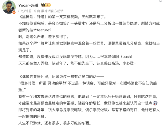 事实上这并不是游戏科学第一次发布贺岁短片了,自从2020年《黑神话:悟空》曝光以来,每年的春节前夕游戏科学都会发布一则贺岁短片。官方也在视频介绍中写道:“本视频是为马年春节专门录制,与游戏实际剧情无关,切勿轻信。”随后,主创团队冯骥和杨奇在社交平台分享了灵感来源和创作历程。