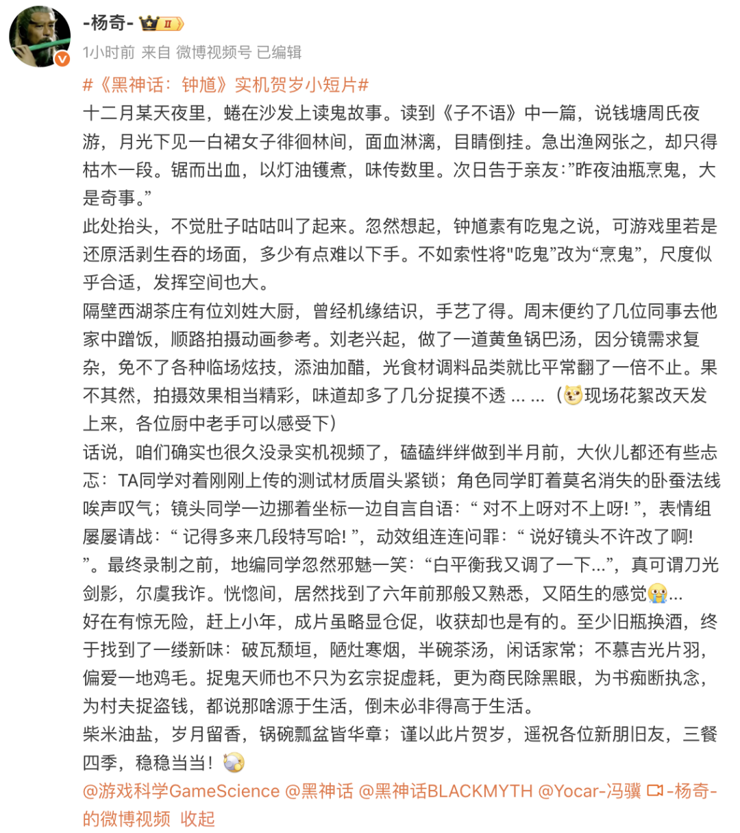 马年春节专门录制《黑神话:钟馗》第一支实机视频