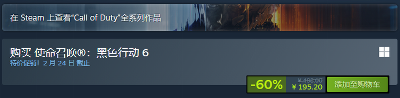 近日《使命召唤:黑色行动6》迎来新史低促销,标准版原价488元,现仅售195.2元。截至发稿前,该作在Steam上总评为“褒贬不一”,好评率为42%。