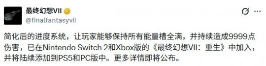 《最终幻想7:重生》PS5版将更新官方作弊器及光线改进功能