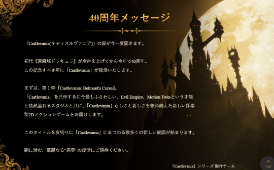 曾经的游戏老厂近期似乎终于想起来自己当年怎么发家的老本行了?今天的索尼发布会公布新作计划,也包括经典新系列《恶魔城:贝尔蒙特的诅咒》,而且专门开设了新的SNS账号(@Castlevania_JP)。 ·今年是《恶魔城》诞生40周年,科乐美选择今年重启《恶魔城》项目意义非凡,而且还在纪念贺词中明示《恶魔城:贝尔蒙特的诅咒》只是全新系列启动第一弹游戏,敬请期待。 ·科乐美纪念《恶魔城》诞生40周年贺词: 《恶魔城》的大门如今再次开启。 距离一代《恶魔城》呱呱坠地今年已经40周年。 这个值得纪念的年份我们要复活《恶魔城》。 首先是第一弹《恶魔城:贝尔蒙特的诅咒》。 我们与才华横溢的Evil Empire、Motion Twin工作室合作打造,传达给玩家们兼具《恶魔城》传统特色与新意的探索型2D动作新游。 仅以本作为引子,将开启更多围绕《恶魔城》的新策划作品。 敬请期待那些潜藏在暗影处、华丽的“噩梦”的重生吧。 |