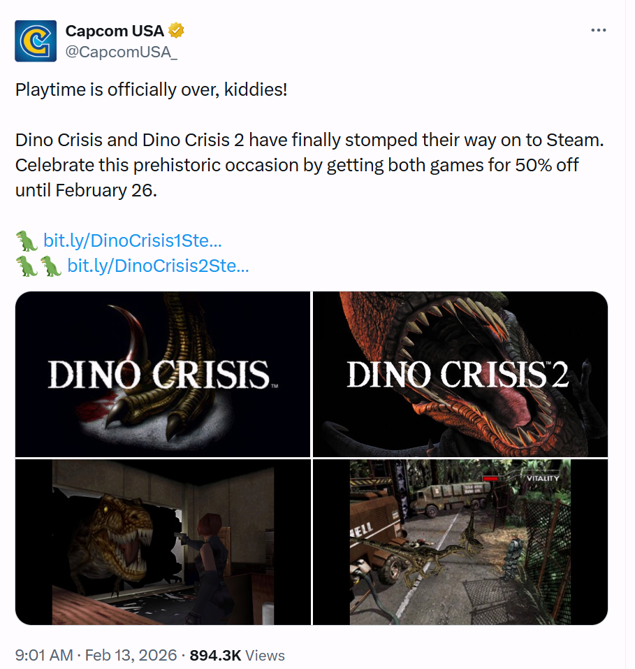 近日,卡普空为经典游戏粉丝带来了一份惊喜大礼——《恐龙危机》1与2两部作品现已突然上架Steam平台,并同步开启首发折扣,一起来看看吧! 《恐龙危机》是由卡普空旗下《生化危机》开发团队打造的生存恐怖动作冒险游戏。两部作品分别于1999年与2000年在初代PlayStation平台首发,如今终于登陆Steam。需要说明的是,本次上线的并非重制版本,而是针对现代系统进行优化的移植版。 第一部游戏采用了改进版DirectX渲染器,新增渲染选项,渲染分辨率提升至接近4K(1920p),支持32位色深,优化了几何计算、变换稳定性、纹理映射、Alpha透明与游戏注册表设置。动画、视频与音乐播放流畅无卡顿,存档功能完善,并支持现代控制器。 《恐龙危机2》则包含以下优化:完全兼容Windows 10与Windows 11,新增2种语言本地化,加入简单难度模式(恐龙竞技场与恐龙对决),以及前作所述的所有其他改进。续作在图形设置上还增加了显示模式、画面表现、宽高比修正、缩放方式、垂直同步、伽马校正、各向异性过滤与抗锯齿选项。 |