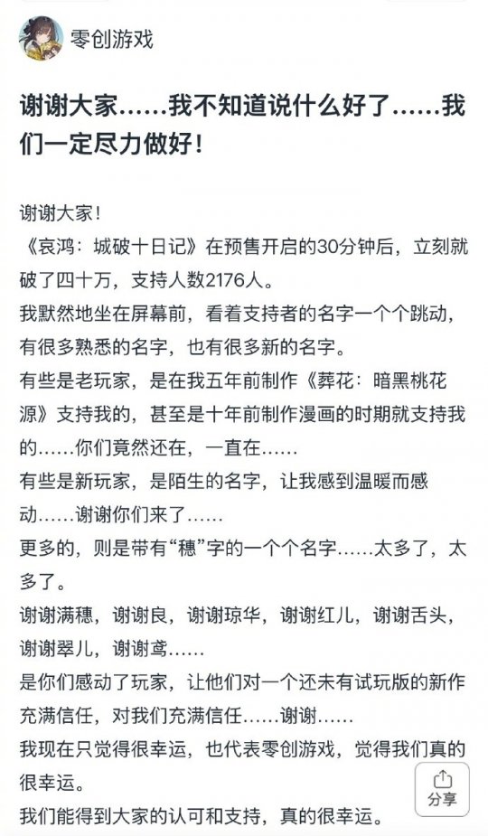 近日零创游戏工作室旗下单机新作《哀鸿:城破十日记》开启预售活动。虽然制作组最初设定的众筹目标仅1万元,但在开启预售后短短30分钟内,支持金额就突破40万元,参与人数超2100人。 面对如此巨大的热情,工作室主创感叹仿佛置身梦境。他在屏幕前看着支持者的名字一个个跳动,其中既有陪伴了五年的老玩家,也有初次见面的新面孔,这种信任让制作团队感到幸运。 此前零创游戏凭借《葬花:暗黑桃花源》《饿殍:明末千里行》等作品积累了极佳的口碑。《哀鸿:城破十日记》是《饿殍:明末千里行》衍生篇章,延续明末饥荒背景,拓展新角色与剧情线。 《哀鸿》的故事背景设定在动荡的明末,采用双篇章结构。记篇讲述了乙酉年间扬州城破前后的残酷十日,这段剧情参考了真实史料,力求还原那段沉重的历史。忆篇则回溯了崇祯十五年起的江南繁华。玩家将扮演书生方知宥,在记忆缺失的痛苦中挣扎,试图解开名妓苏怜烟坠河身亡的真相。 工作室表示,此次众筹更像是一次粉丝与开发者的双向奔赴。众筹不仅是为了筹集资金,更是希望通过这种方式与核心玩家分享创作喜悦,将这个融合了残忍与唯美、正面且有力量的故事讲给更多人听。 |