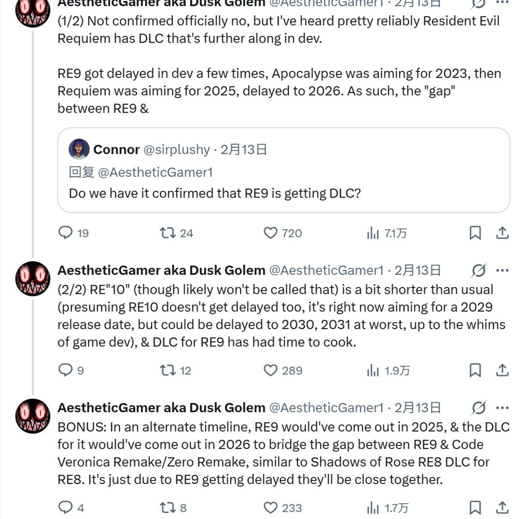 专注于《生化危机》爆料的知名舅舅Dusk Golem最近发推,谈到了《生化危机9》的DLC以及未来的《生化危机》发售安排,他甚至提到《生化危机10》目前计划在2029年发售。 他表示,《生化危机9》的DLC比预期地开发进度更快,这是因为《生化危机9》的开发曾多次延期,《生化危机:启示录》原定于2023年发售,《生化危机9:安魂曲》原定于2025年,后延期至2026年。 因此,《生化危机9》与《生化危机10》之间的“间隔”将比往常的代际间隔(4-5年)更短一些。前提是《生化危机10》也不延期,目前瞄准的是2029年发售,但也有可能跳票到2030年,最糟糕的情况是在2031年,这取决于游戏开发商的意愿。 他还补充说,如果《生化危机9》不跳票到2026年,那么其DLC就能在2026年上线这样就能填充《生化危机9》和《生化危机:代号维罗妮卡》/《生化危机0:重制版》之间的空缺。就是因为《生化危机9》延期了,和《生化危机10》才会相隔这么近。 有传言称,《生化危机9》的DLC将以艾丽莎·阿什克罗夫特(格蕾丝的母亲)为主角,很可能是以闪回/前传的形式呈现。 此前,Dusk Golem曾暗示《生化危机9》将是几位深受玩家喜爱角色的最终章。《生化危机10》(很可能不会以“10”命名)将在一个陌生的世界中开启全新的故事篇章。 如果粉丝们还想玩到更多卡普空出品的恐怖游戏,那么未来几年看起来前景光明。 |