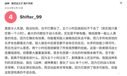 在经历了无数传闻和猜测后,《战神》系列新作终于面世。它不是3A大作,而是一款风格较为温和的类银河战士恶魔城游戏,探索奎托斯的过去。遗憾的是,这款游戏的反响并不像预期的那样积极。 《战神:斯巴达之子》目前是该系列游戏中在Metacritic评分最低的。口碑甚至低于《战神:升天》,而后者当初的评价也并非一片正面。 在Metacritic网站上,《战神:斯巴达之子》的用户评分为7.4分,是该系列中最低的。不过,这个分数也并不算差,只是一般水准。但这可是《战神》,所以8分以下在玩家眼里其实就是口碑不太好的作品。 玩家对这款游戏的总体评价褒贬不一,有人称赞它将该系列游戏拓展到了正统作品之外,而另一些人则批评它过于平淡、缺乏新意且重复性太高。 甚至有人认为,如果没有“战神”这个名字,它只不过是PlayStation商店里众多游戏中的一个。就连该系列的创始人也严厉批评了这个项目,称其是nonsense。 |