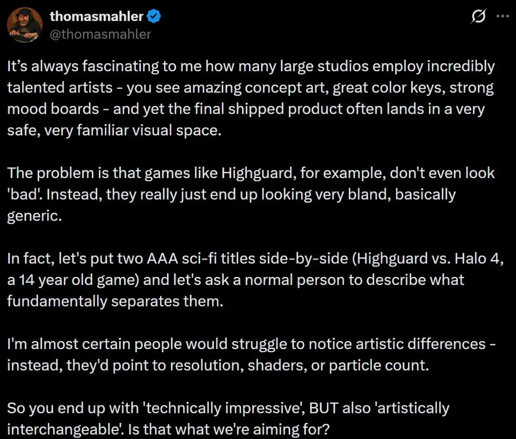 和其他任何一款在线服务型英雄射击游戏一样,《巅峰守卫》昙花一现,这在游戏大奖上亮相后就已在意料之中。正是那次盛会为这款游戏带来了极高的曝光度,但不幸的是,这种曝光度也给开发商Wildlife Entertainment带来了负面影响。 Wildlife Entertainment称这款游戏“独一无二”,却遭到玩家抨击,认为它平庸乏味。在此背景下,《奥日》《恶意不息》开发商Moon Studios总监也加入了讨论,就当前游戏行业的“平庸”现状发表了自己的看法。 《奥日与黑暗森林》开发商Moon Studios CEO Thomas Mahler最近发推,讨论了近年来游戏行业存在的问题。他表示,尽管游戏行业不乏有才华横溢的员工和令人惊叹的概念艺术,但最终结果却不尽如人意。 Thomas Mahler后来以《巅峰守卫》为例,称其是“一款平庸之作”。为了进一步阐述自己的观点,他将这款游戏和14年前的《光环4》进行比较,可以看出两者在艺术风格上并无差异,只有技术上提升。 过去几年,游戏画面趋于同质化,这一点一直备受关注。玩家普遍认为虚幻5是罪魁祸首,但Epic Games的CEO却表示这是因为开发者偷懒,因为该平台提供了丰富的素材和光照效果,即使是业余爱好者也能轻松制作演示DEMO。 另据报道,《巅峰守卫》的玩家数量已流失99% ,这也导致了Wildlife Entertainment的裁员。纵使有来自前重生娱乐的开发人员,但现在的境地实在令人失望。 Thomas Mahler推文: “一直让我觉得很有意思的一点是:大型工作室里明明聚集了大量才华横溢的艺术家——你能看到惊艳的概念设计、优秀的色彩设定、扎实的情绪板——但最终发售的成品却常常落入一种非常安全、非常熟悉的视觉空间。 问题在于,像《巅峰守卫》这样的游戏甚至谈不上“难看”。它们只是显得非常平淡,几乎就是一种通用模板式的视觉风格。 事实上,如果把两款3A科幻作品放在一起对比(比如《巅峰守卫》和《光环4》 ——一款14年前的老游戏),让一个普通玩家来说说两者在艺术层面上的根本差异,我几乎可以肯定,大多数人很难指出真正的艺术差别——他们更可能谈论分辨率、着色器效果或者粒子数量。 于是结果就变成了:“技术层面令人印象深刻”,但同时“艺术层面可以互相替换”。 这真的是我们想要的方向吗? 我们现在在电影和电视剧领域也看到类似的趋势。 所谓的 “Netflix打光”,几乎已经成为一种非常扁平化、高度易读、算法安全的视觉语言的代名词。 出于某种原因,那些大型制作背后的艺术家们不知何故决定让灯光尽可能地平淡——但是……为什么?! 相比之下,像康拉德·霍尔这样的摄影师的作品则截然不同,他们的灯光运用不仅仅是为了保证画面的清晰度,更是为了展现作品的风格。我的意思是,看看康拉德·霍尔在这里创作的作品就知道了。 虽然是20年前的技术,但视觉效果比我今天看到的任何东西都好20倍。。 技术保真度在不断提高。如今任何业余创作者,只要在虚幻5引擎里丢进一些资产和灯光,就能做出这种 “《巅峰守卫》风格” 的画面。 但是……艺术性去哪了?” |