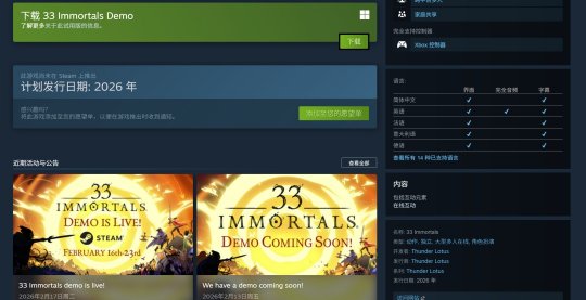 最初于2023年公布的动作肉鸽合作游戏《33不朽灵魂(33Immortals)》,其试玩版于今日在Steam与Epic平台上线,《33不朽灵魂》正式版预计今年下半年发售。 在经历多年的开发后,开发团队于昨日起至2月23日止开放《33不朽灵魂》试玩版,玩家将可以体验长达60分钟的33人合作模式。 官方同步释出实机宣传片,揭开战斗特色: 《33不朽灵魂》由加拿大独立游戏开发商Thunder Lotus Games开发,该工作室曾打造过《灵魂摆渡人》、《巨人约顿》、《Sundered》等游戏。 当前提供的是限时试玩版,约可体验1小时的游戏内容。《33不朽灵魂》仍处于积极开发阶段,因此可能会在正式上线前对内容进行调整。 《33不朽灵魂》是款支持33人一齐上阵的动作Roguelike合作游戏。玩家将扮演誓不屈服的罪人,反抗神的最终审判。随时开团出击,协力战胜怪物大军,击败巨大头目,直面神的怒火,为夺得永生之力而战。 |