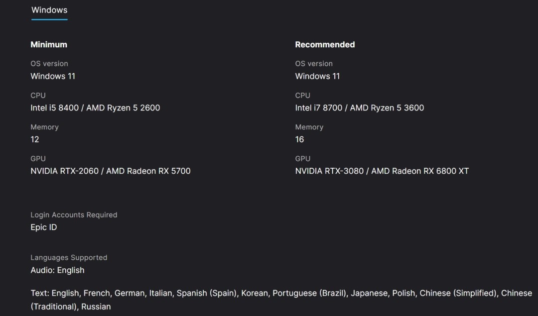 近日CI Games公布了《堕落之主2》PC配置需求,本作将登陆Epic平台。现在让我们一起来看看,运行这款游戏需要怎样的PC配置? 最低配置 操作系统: Windows 11 处理器:Intel i5-8400 或 AMD Ryzen 5 2600 显卡:NVIDIA RTX 2060 或 AMD Radeon RX 5700 内存:12GB 推荐配置 操作系统: Windows 11 处理器:Intel i7-8700 或 AMD Ryzen 5 3600 显卡:NVIDIA RTX 3080 或 AMD Radeon RX 6800 XT 内存:16GB 遗憾的是,目前不知道这些配置分别对应什么样的画面设置、分辨率和帧率。《堕落之主2》使用虚幻5引擎开发,将于今年发售。 |