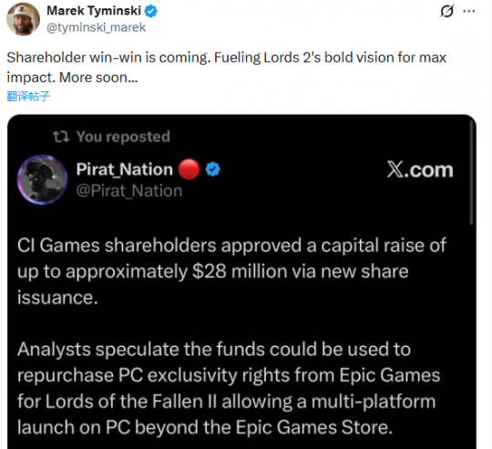 CI Games管理层正积极奔走于各大投资和股东会议,为《堕落之主2》筹集更多资金。最近公司CEO Marek Tyminski暗示,该作可能会登陆Steam平台。 此前CIGames与EpicGames签署了“永久独占”法律协议,这意味着该作原本计划仅在Epic上发售。不过随着新资金的注入,CIGames似乎有意通过“买断”协议来解除独占枷锁。 MarekTyminski在推上转发游戏博主Pirat_Nation的推文,并评论称即将达成一个股东双赢的局面,旨在为《堕落之主2》创造最大影响力。面对期待Steam版的玩家,他也给出积极回应。 这种转变背后的原因显而易见。EpicGames的2025年度报告显示,即使同一款游戏在Epic免费赠送,依然有高达40%的玩家宁愿在Steam上花钱购买,也不愿打开Epic客户端。 当然想摆脱Epic并非易事,CIGames因获得Epic大额投资而取消过2024年融资计划,Epic究竟注资了多少、解除独占需要支付多高的代价,目前仍是未知数。如果双方谈不拢,或许最终只能在法庭上见分晓。 |