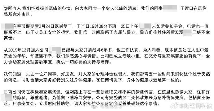 2月27日,米哈游内部发文回应米哈游员工意外离世。具体内容如下: 我们怀着极其沉痛的心情,向大家同步一个令人悲痛的消息:我们的同事**意外离世。**在春节假期后于2月24日返岗复工,当日19时08分下班。25日上午**未如常参加早会,电话也一直联系不上,出于对员工安全的担忧,我们第一时间联系了家属与警方。警方前往其住所后发现已经不幸离世。 从2019年12月加入公司已经与大家并肩战斗6年多,他工作认真,为人和善,现本该是处在人生中最黄金的年华,却遭遇不幸,我们深感痛心与惋惜。公司已成立专项小组,在充分尊重家属意愿的前提下,全力协助家属处理善后事宜,提供一切必要的支持与陪伴。 我们知道,失去一位好同事、好朋友,对大家的心理冲击也很大,我们都需要一些时间来消化这个过于突然的消息。同时也请大家务必特别关注身体健康。在任何情况下,身体的健康永远是第一位的。 目前公司仍在积极和家属沟通,但网络上存在一些断章取义和不实的猜测传言,在这里也恳请大家,保护好**的隐私,尊重逝者,为他留下清净与安宁。 公司有完整的员工关怀政策来为意外情况兜底,包括商业保险、后事安置金、专项慰问补助等,请大家相信公司肯定会妥善处理好这个事情。 |