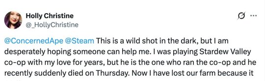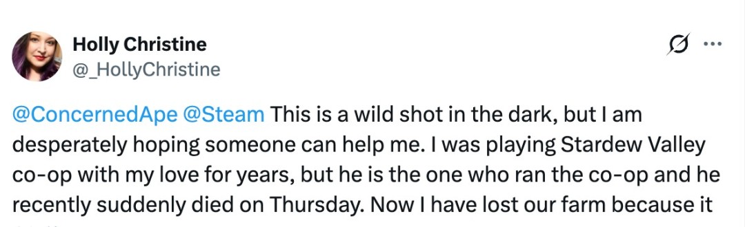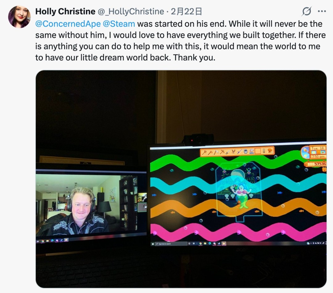 近日,一位《星露谷物语》女玩家向游戏制作人ConcernedApe发文求助,她与她的爱人多年来一起游玩多人模式,平时都是爱人管理游戏存档,但他最近突然不幸离世,他们的农场也因此无法访问。