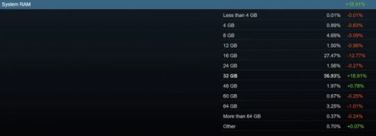 Steam平台最新发布的2026年2月硬件调查数据显示,显卡市场格局迎来剧烈震荡。长期占据榜首的GeForce RTX 4060首次让位,取而代之的是NVIDIA新一代主力——GeForce RTX 5070。 数据显示,RTX 5070的市场份额从1月的2.87%飙升至2月的9.42%,单月增长率高达228%,创下Steam硬件调查有史以来最剧烈的份额变动。值得注意的是,这一增长并非源于RTX 4060的下滑,而是RTX 5070自身的爆发式普及。 紧随其后的是GeForce RTX 5060——这款配备8GB显存的Blackwell架构入门型号,目前因显存短缺成为NVIDIA优先供货的产品。其市场份额环比激增近168%,达到6.72%,稳居第二。 其他RTX 50系显卡同样表现抢眼。RTX 5060 Ti尽管价格大幅上涨,但具体8GB与16GB版本的增长情况尚不明确;RTX 5080的份额也从1.25%升至1.66%。值得一提的是,此前刚刚亮相的AMD RX 9000系列,在本月榜单中意外消失。 另一个显著变化来自系统内存配置。数据显示,32GB内存以56.93%的占比首次成为Steam玩家最主流的内存容量,环比增长18.91%。与此同时,长期占据主导的16GB内存份额则从近40%下滑至27.47%。 |