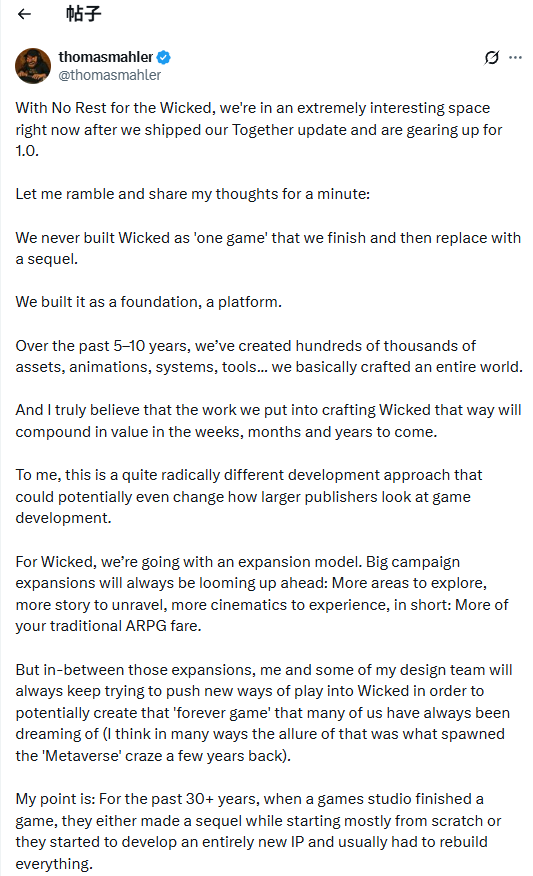《恶意不息》CEO再发长文:希望游戏能永远玩下去!