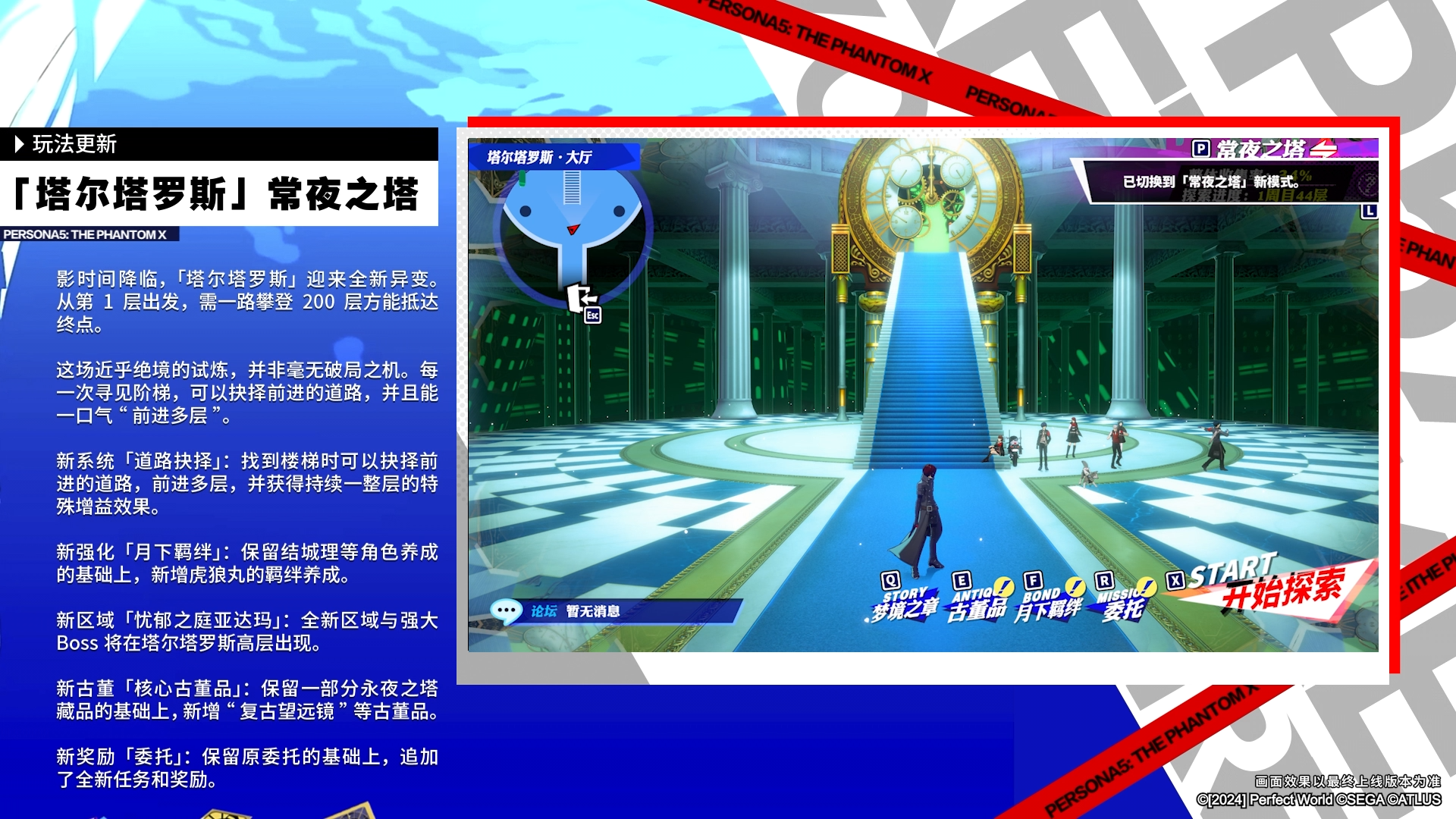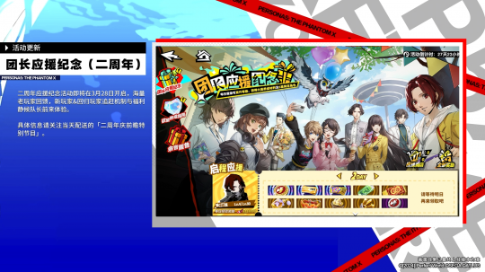 活动剧情——苍犬忠义的咆哮 严户台商店街已经是颇为熟悉的地方,正思索着为何再次被神秘之门传送到这里,星辉忽然在怀老鸭汉堡店中看到了熟悉的身影?可惜阴影阻拦住去路,导致大家未能及时追寻到同伴的踪迹……不过,理那边倒是有两名同伴率先会合,他们都有明显的不同寻常之处…… 阳光明媚的公园中,少女有说有笑地练习着抛接球,聪明的小狗似乎察觉到她隐藏的心思,主动靠近……在这美好的理想世界背后,大型阴影究竟藏身于何处? P3R联动角色「虎狼丸」登场! 五星限定联动诅咒属性屈从角色「虎狼丸」获取概率限时UP! 认知模拟试用角色与虎狼丸梦境之章更新! 联动BOSS更新 联动挑战-隐者 本是9月出现的大型阴影,它潜伏于桐叶购物中心地下,通过电缆不断汲取能量,似乎曾经造成过停电困扰。不知为何,在被结城理一行人击败后,它依旧盘踞于地下,准备排除每一个落入自己领地的入侵者。 玩法更新 「塔尔塔罗斯」常夜之塔 影时间降临,「塔尔塔罗斯」迎来全新异变。从第1层出发,需一路攀登200层方能抵达终点。 这场近乎绝境的试炼,并非毫无破局之机。每一次寻见阶梯,可以抉择前进的道路,并且能一口气“前进多层”。 新系统「道路抉择」:找到楼梯时可以抉择前进的道路,前进多层,并获得持续一整层的特殊增益效果。 新强化「月下羁绊」:保留结城理等角色养成的基础上,新增虎狼丸的羁绊养成。 新区域「忧郁之庭亚达玛」:全新区域与强大Boss将在塔尔塔罗斯高层出现。 新古董「核心古董品」:保留一部分永夜之塔藏品的基础上,新增“复古望远镜”等古董品。 新奖励「委托」:保留原委托的基础上,追加了全新任务和奖励。 玩法更新 怪盗幻象 怪盗幻象的试炼挑战再度开启,在特别挑战玩法中,队长可通过合理搭配阵容,完成多个试炼关卡的考验,并挑战由梅洛普安排的特殊认知对手。 同时,经过梅洛普的精心设计,主人公也会面临更高难度、多个阶段的长线战斗。在完成挑战的过程中,主人公在完成特定的阶段后,可以更换出阵的怪盗伙伴。 活动更新 团长应援纪念(二周年) 二周年应援纪念活动即将在3月28日开启,海量老玩家回馈,新玩家&回归玩家追赶机制与福利静候队长前来体验。 具体信息请关注当天配送的「二周年庆前瞻特别节目」。 优化清单 都市时装预设系统可保存套装穿搭的预设。 欲望画廊玩法的任务系统增加一键领取。 战斗内优化了特殊Buff的闪动效果。 增加了随身听系统的新歌曲。 版本同期系列活动同步开启、战斗玩法更新与奖励重置,别忘记查看活动界面更新! 预祝队长在游戏内体验愉快! |